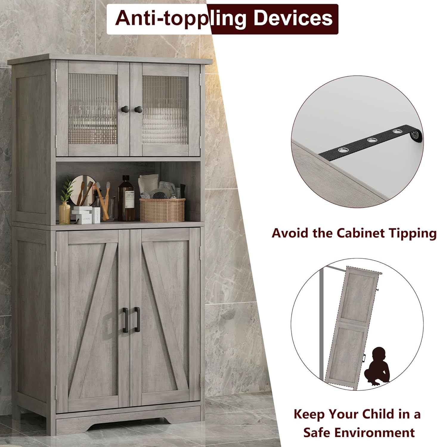 GarveeHome 54in Tall Bathroom Cabinet, Farmhouse Storage Cabinet with Glass Doors and Adjustable Shelves, Freestanding Kitchen Pantry Cabinets, Cupboard for Living Room, Dining Room, Gray