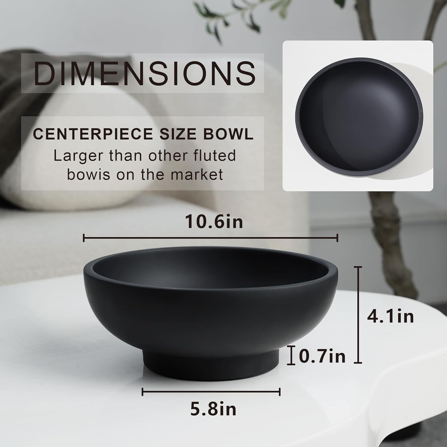 Large Black Decorative Bowl for Home Decor - Modern Concrete Fruit Bowl for Kitchen Counter or Coffee Table