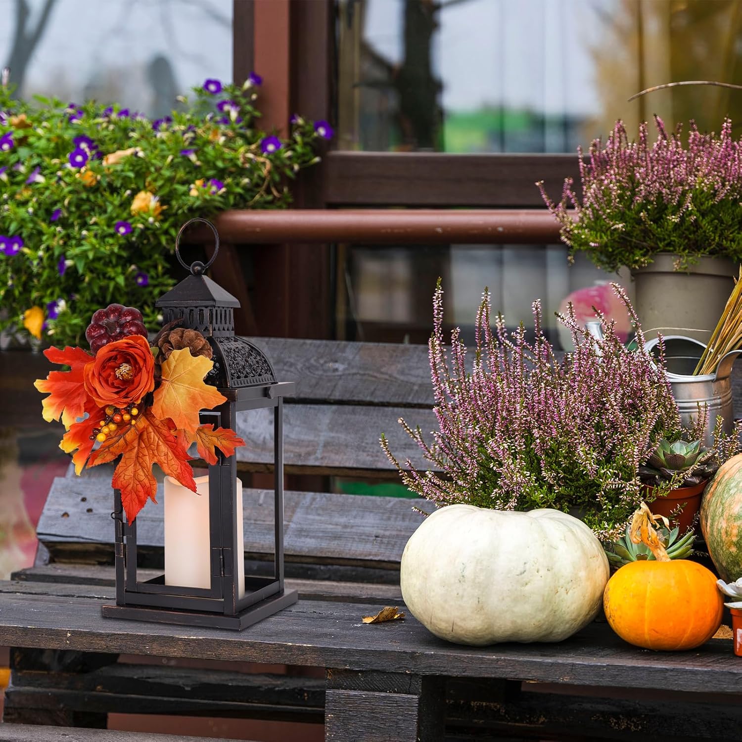 NEEDOMO Fall Decorations for Home, 15'' Fall Lantern Indoor Outdoor Thanksgiving Decor, Vintage Metal Hanging Candle Holders with Fall Teardrop Wreath and LED Candle for Patio, Porch, Table
