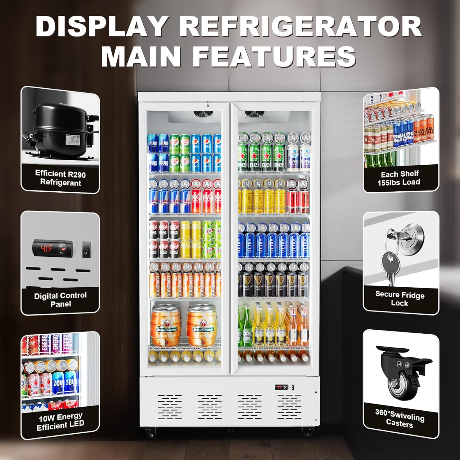 30.5 Cu.ft. Commercial Refrigerators 2 Glass Door Commercial Beverage Refrigerators Upright Display Cooler with Soft LED Light and 10 Adjustable Shelves for Restaurant Grocery Stores Home