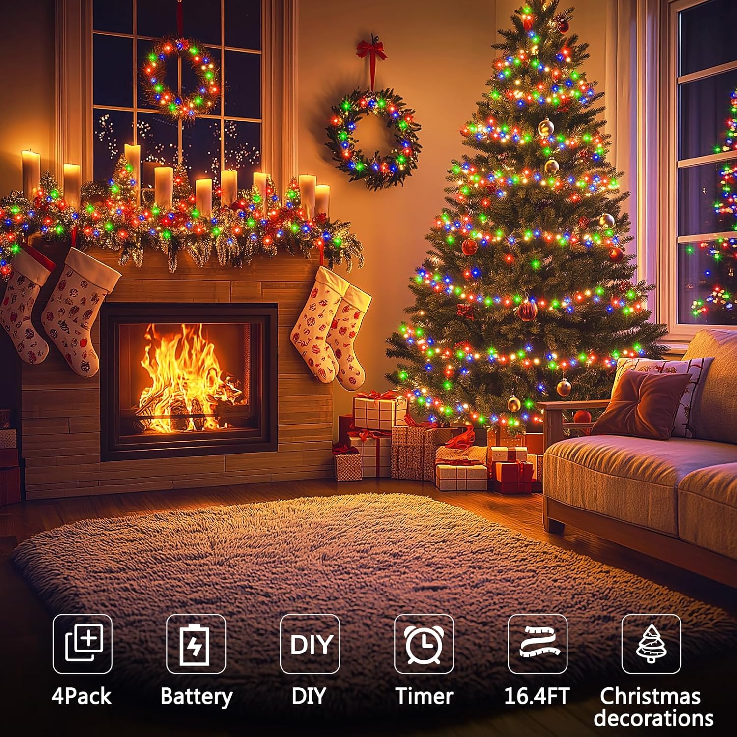 4 Pack Christmas Fairy Lights Battery Operated, 16.4FT 50 LED Dark Green Wire Twinkle Lights with Auto Timer Waterproof, Outdoor String Light for Indoor Outdoor Bedroom Yard Decor (Multicolor)