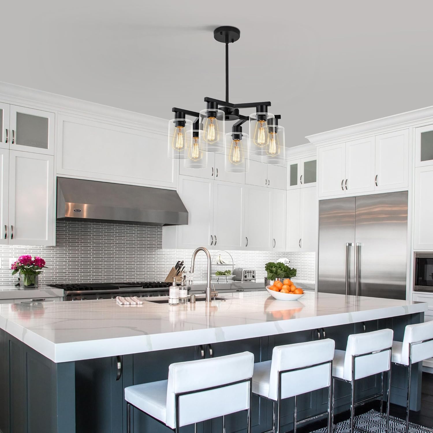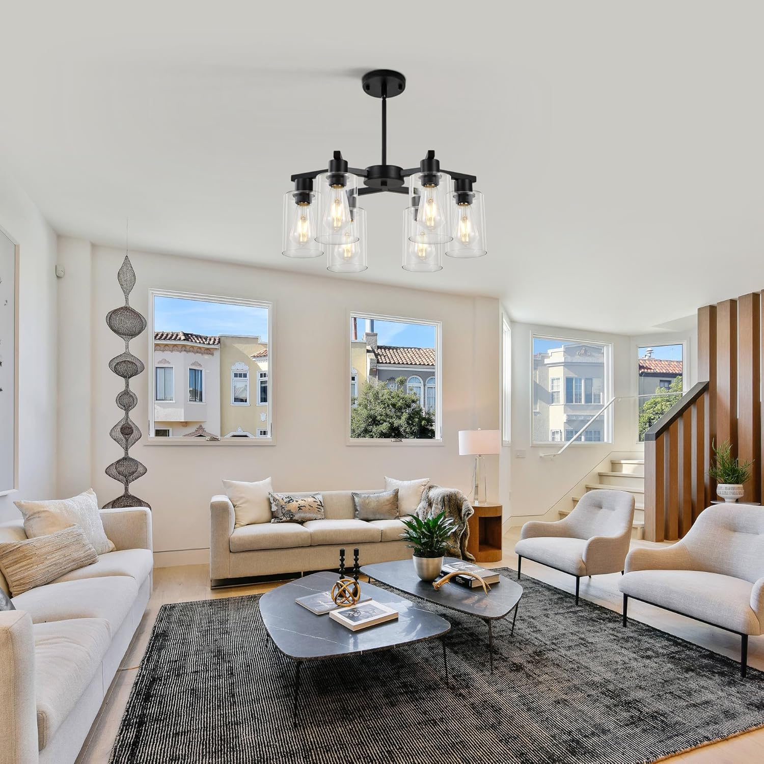 - 【Unique contemporary design】This black chandelier has three elegant “Y” shaped arms that reach out from the center in a distinctive interlocking shape, paired with six cylindrical glass shades to create a striking geometric silhouette. The modern glass chandelier body is crafted from high quality metal with a matte finish for a premium and classy texture. The transparent glass shades are like a light veil, gently wrapping the light and scattering it softly. The shades and the metal body reflect each other, perfectly blending the ruggedness of the industrial style with the sophistication of the glass, highlighting the unique style.
