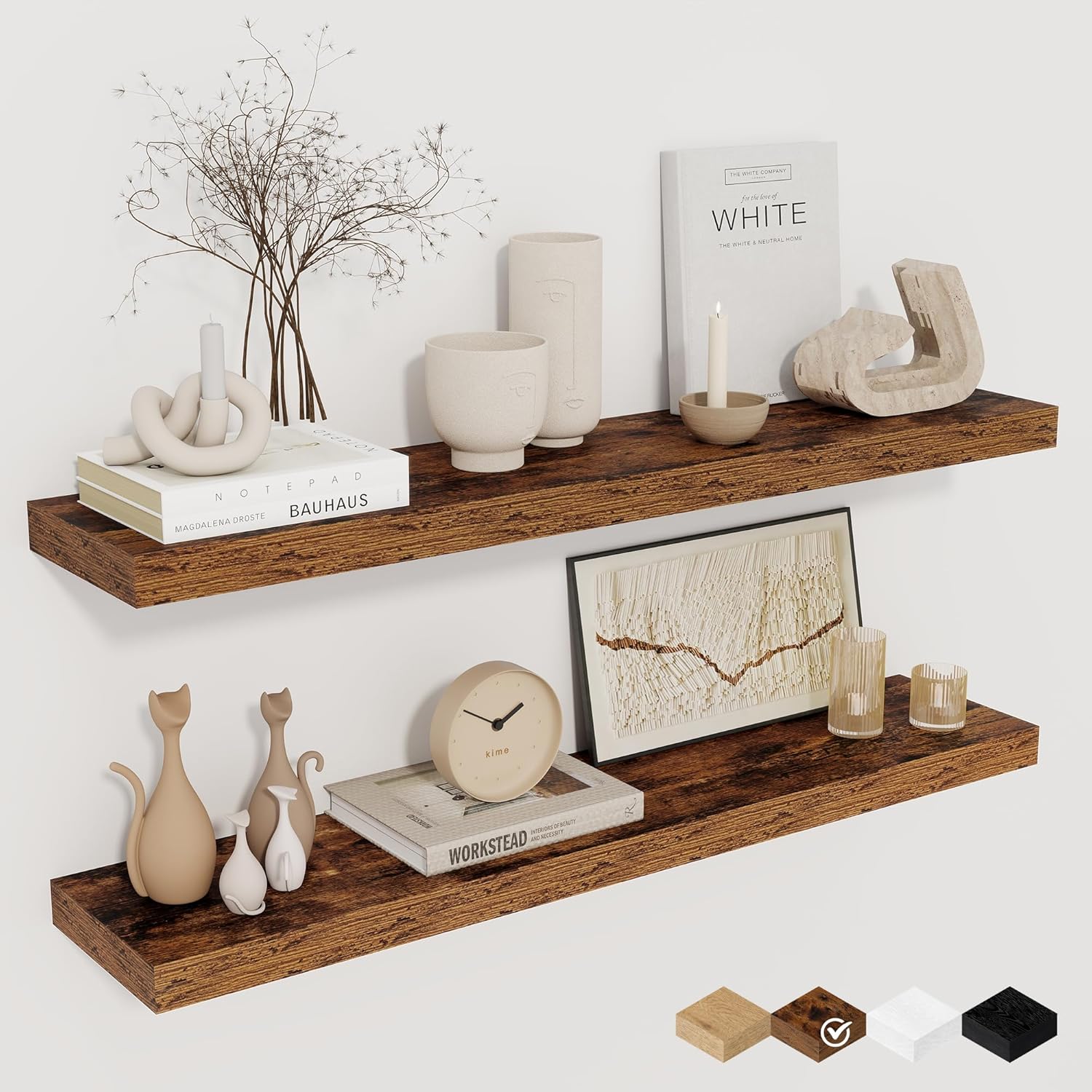 - STYLE & VERSATILITY: Elevate your home with our set of 2 elegant wall shelves, designed for versatile display options. Arrange them side by side for a clean, unified look, or stagger them for a bold, dynamic effect. Adding a touch of sophistication while providing practical storage