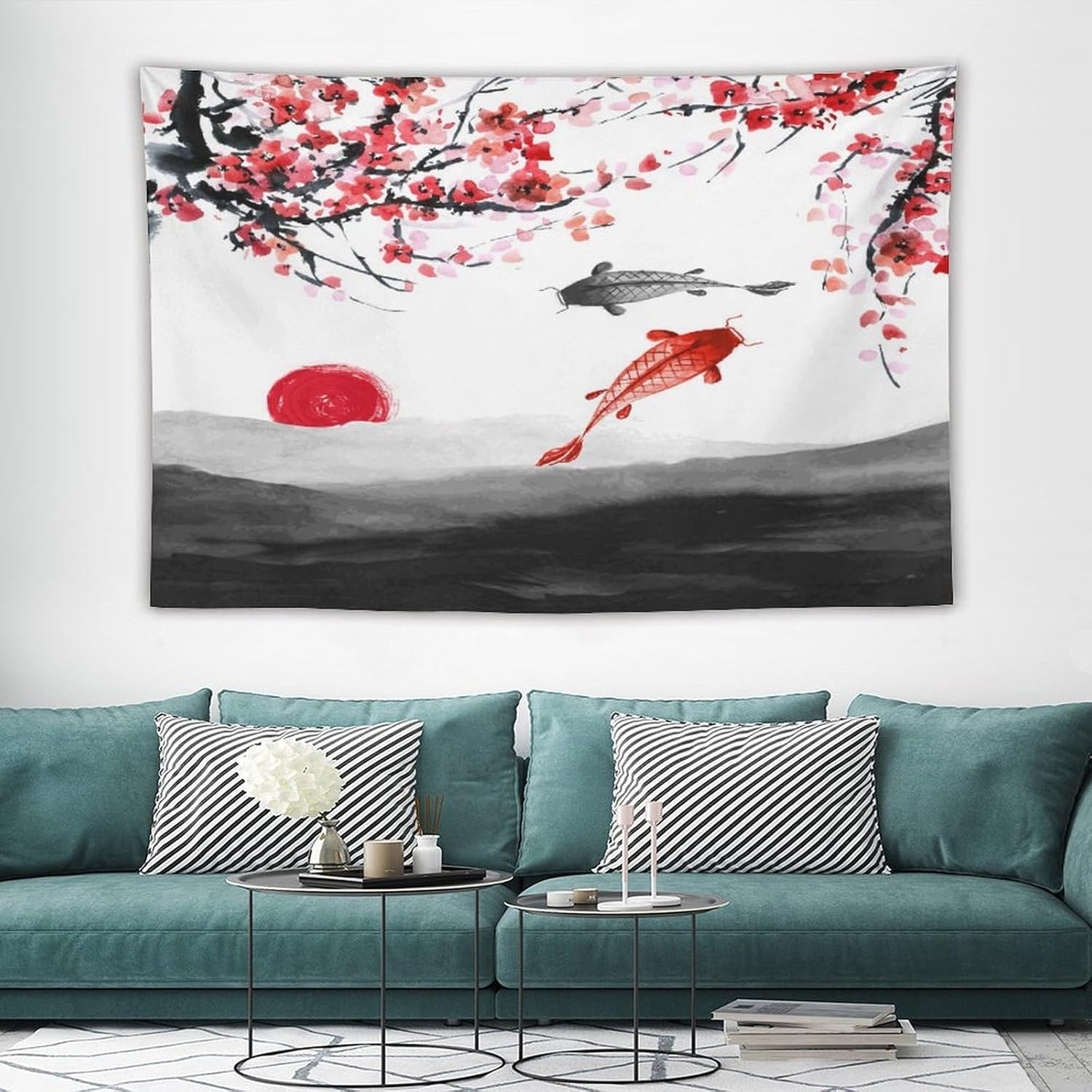 Houselerax Japanese Koi Fish Tapestries, Cherry Blossoms Asian Oriental Flower Branch Koi Fish Carp Tapestry Wall Hanging for Bedroom Living Room Office Decor 90"x60"