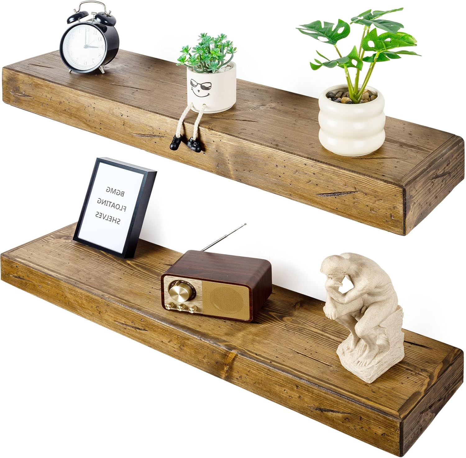 - Premium Handcrafted Solid Wood Shelves: Our floating shelves are made from 100% real solid pine wood, handcrafted to showcase the natural grain and unique knots of the wood. The rustic stain adds a timeless farmhouse charm, enhancing any home decor.
