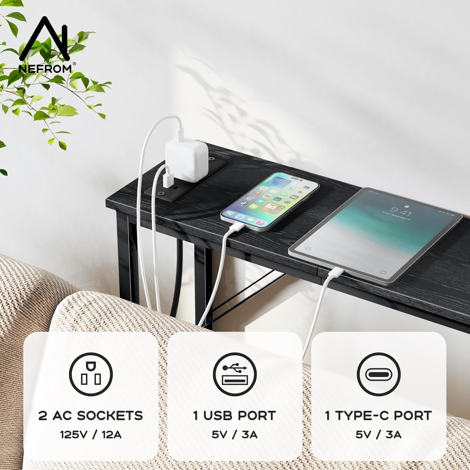 - 【CONSOLE TABLE WITH FAST-CHARGING STATION】---This size 7.9"D x 39.4"W x 31.5"H sofa table is equipped with 2 AC, 1 USB + 1 TYPE-C(5V 3A ) fast-charging ports, the power cord is 5 feet long, convenient to charge your mobile phone, computer, ipad.