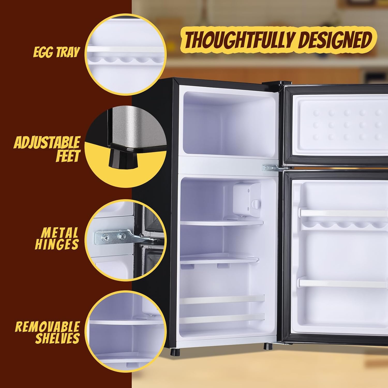- Mini Fridge with Double Door : The fridge adopts a multi-functional independent dual-zone design, featuring both freezing and refrigeration functions. 1.6 cu.ft of space is used to store chilled foods such as beverages, fruits and milk. The 0.8cu.ft freezer is perfect for storing meat and ice cream. Meet your food storage needs