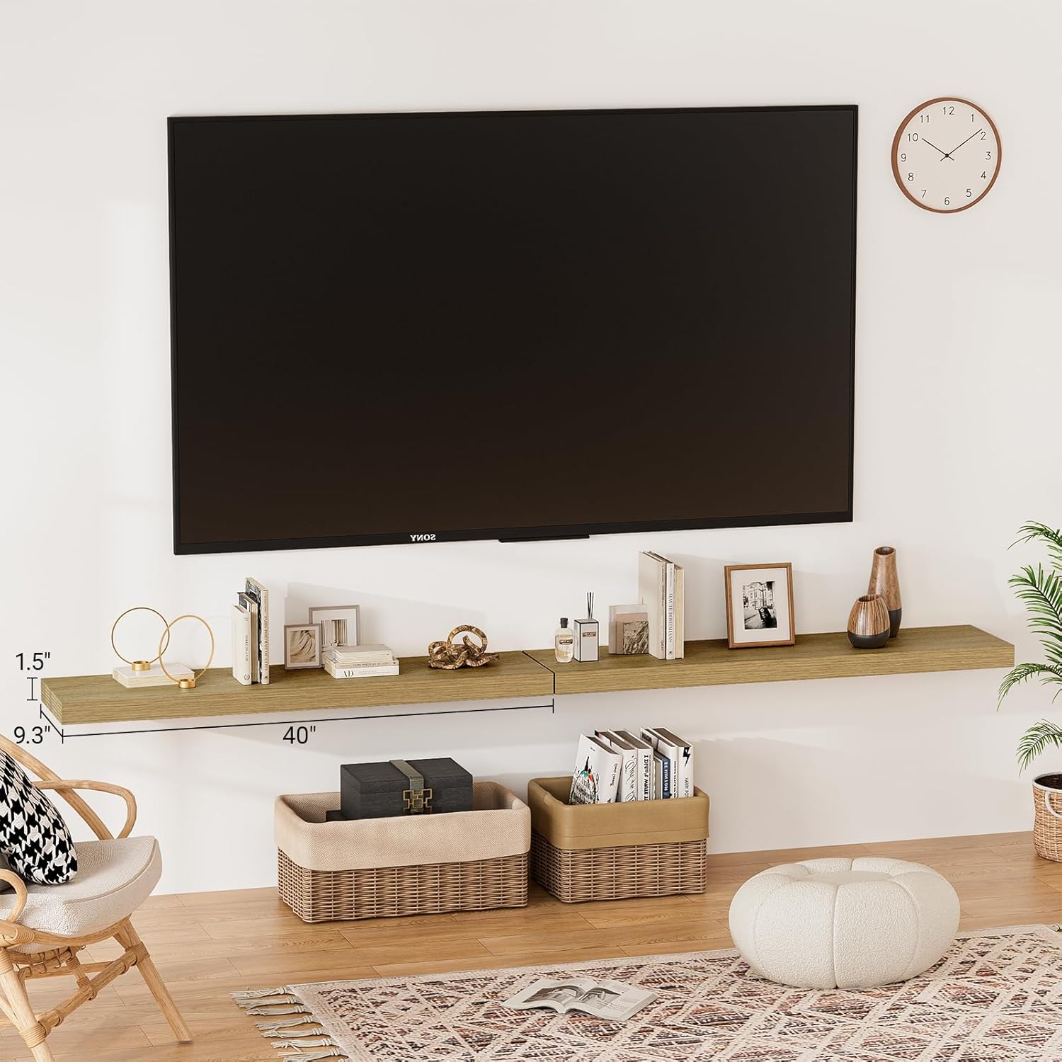 - 【Longer Design】Our pretty wall shelves are 40"W x 9.3"D x 1.5"H.Our white oak floating shelves is longer than traditional designs and can hold more items.The oak floating shelves optimize wall space,helping organize essentials without taking up floor space in your home.