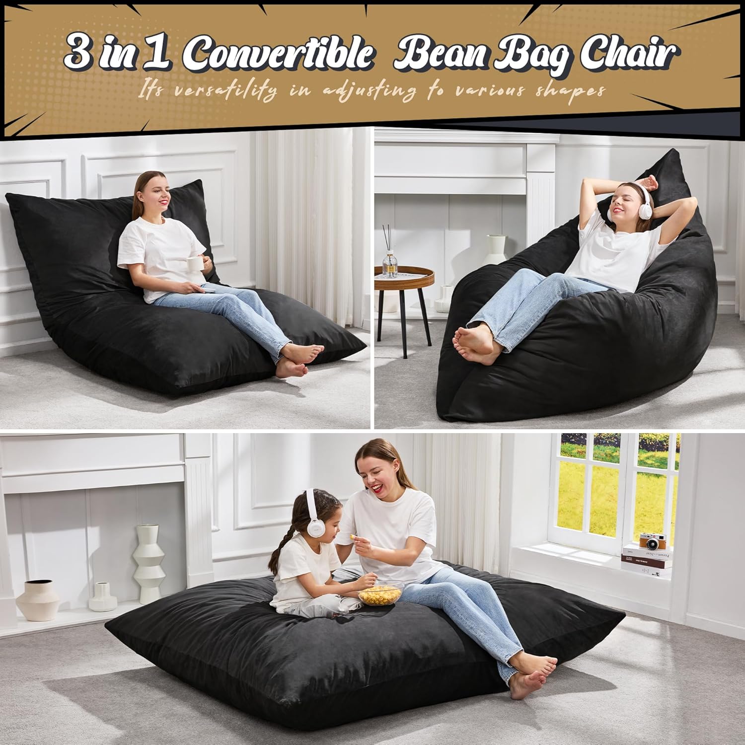 Hobestluk 3 in 1 Bean Bag Chair Giant Bean Bag Chairs for Adults with Velvet Cover Convertible Bean Bag Floor Cushion with Machine Washable Cover for Living Room (Velvet Black)