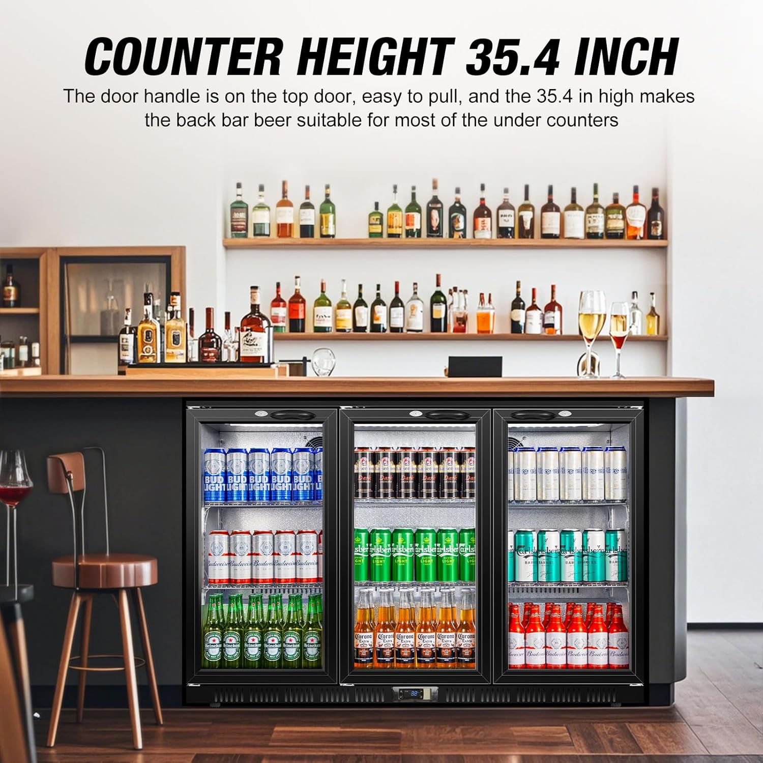 - 12 CU. FT. 53.15 INCH PERFECT FIT FOR ANY SPACE: With a counter height of 35.43 inches, beverage fridge with Three Glass Doors is designed to fit under most counters seamlessly. It’s the ideal beverage refrigerator for your home bar, kitchen, or entertainment space, offering both style and functionality in one sleek unit.