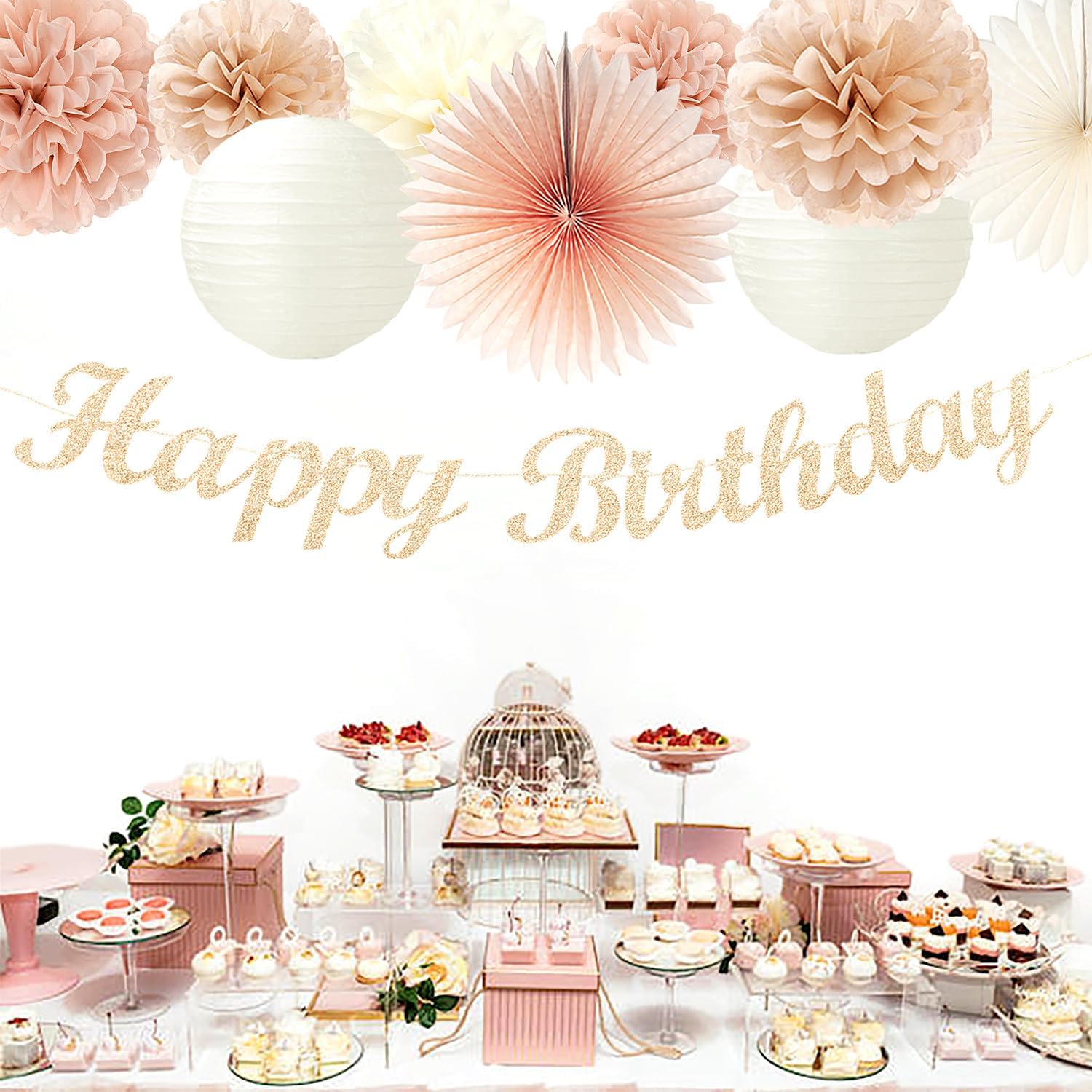 Champagne Rose-Gold Beige Birthday Party-Decorations - 14pcs Happy Banner Boho Lanterns Tissue Pom Poms,Rustic Streamers Garland Fans,Neutral One Sweet Peach Girls Women Hanging Supplies Decor Hugfond