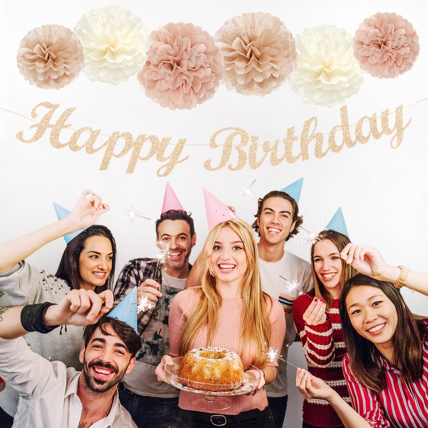 - 【Champagne rose gold beige birthday decorations kit includes】The party decorations kits include 8pcs champagne rose gold beige paper flower, 2pcs paper fans,2pcs 8" white paper lanterns, happy birthday garland and champagne rose gold beige streamers.