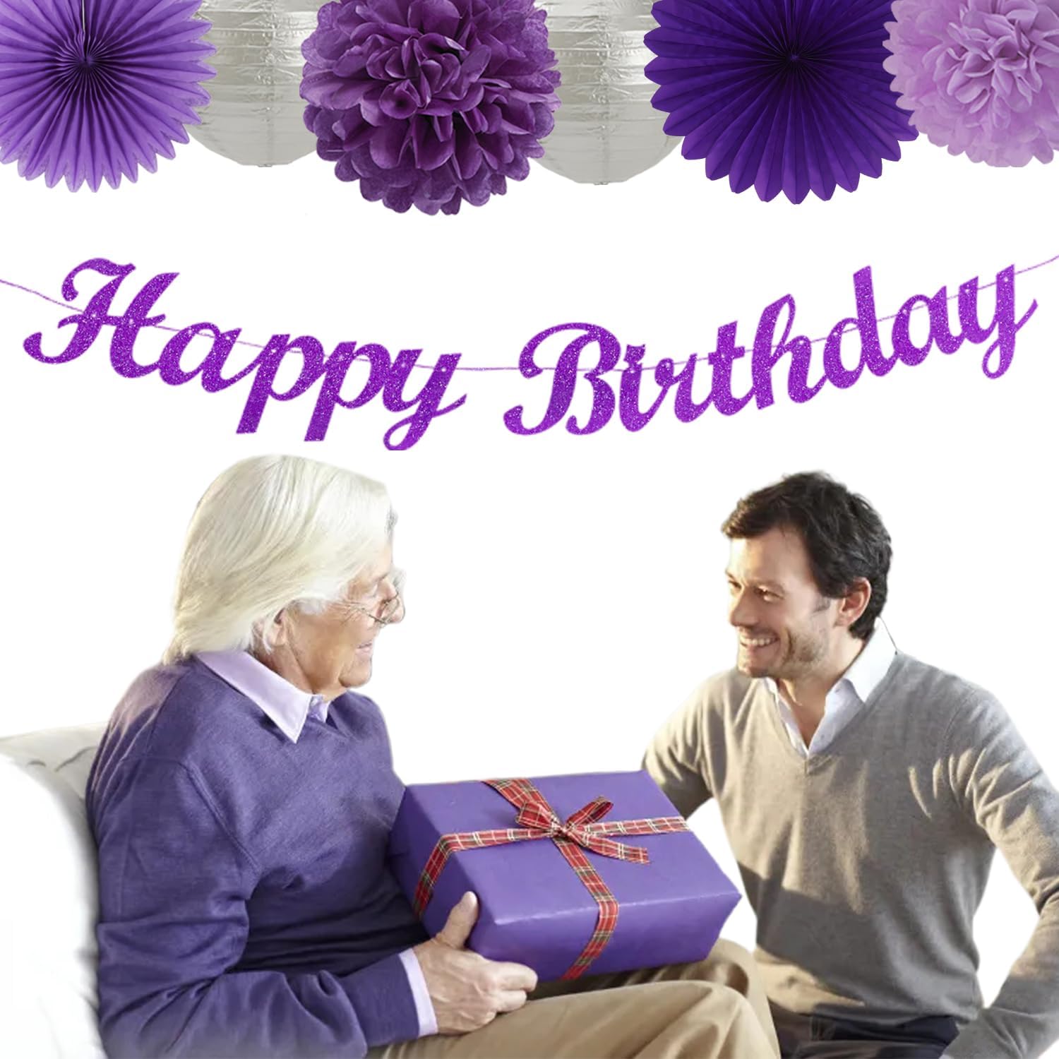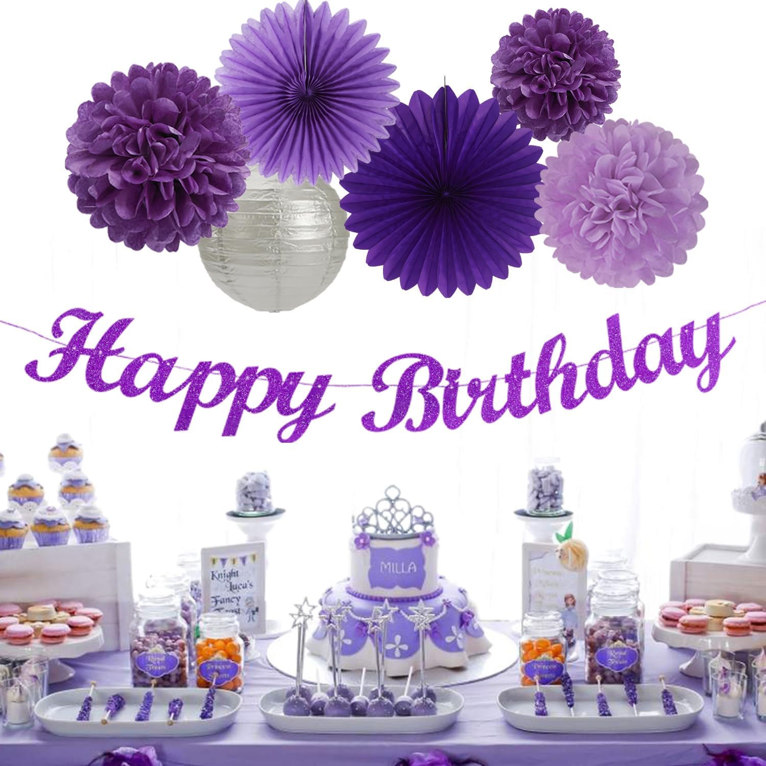 Purple Silver Birthday Party-Decorations Paper-Flowers - 14pcs Happy Banner Lavender Lanterns Tissue Pom Poms,Lilac Streamers Garland Fans,Women Girls Adult Kids Office Hanging Supplies Decor Hugfond
