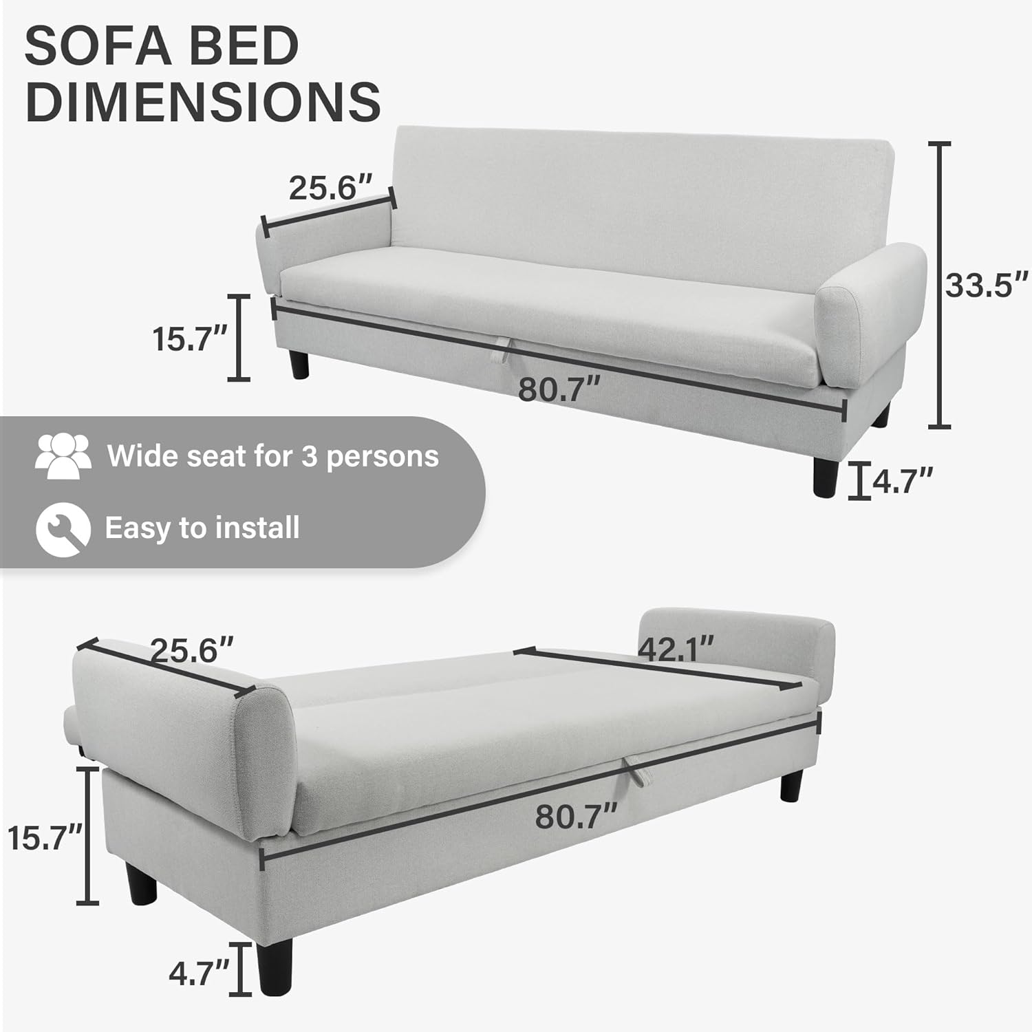 - 【 80.7 Inch Convertible Futon Sofa Bed for Small Spaces】This adjustable sleeper sofa features an 80.7-inch three-seater design, ideal for small spaces like apartments, dorms, and offices. Works as a comfortable couch for daily use and easily converts into a twin-size futon bed for guests.