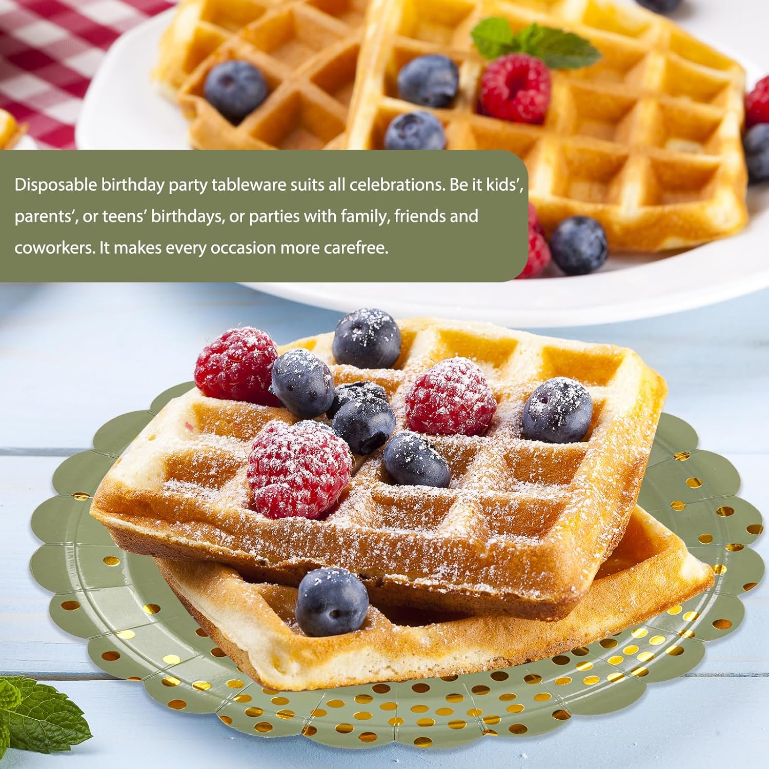 50PCS Sage Green Paper Plates, 7 Inch Scalloped Green and Gold Party Plates Disposable Foil Polka Dots Dessert Plate Cake Plate for Birthday, Baby Shower, Wedding, Bridal Shower St Patricks