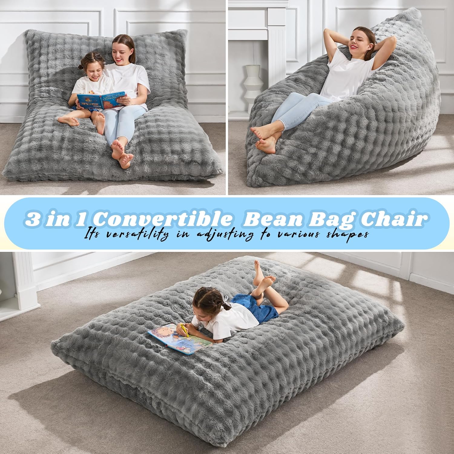 Hobestluk 3 in 1 Bean Bag Chair Giant Bean Bag Chairs for Adults with Bubble Cover Convertible Bean Bag Floor Cushion with Machine Washable Cover for Living Room (Bubble Grey)