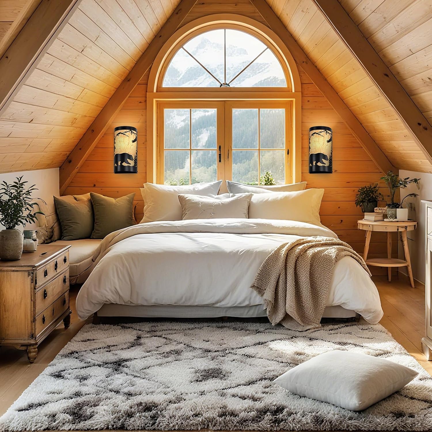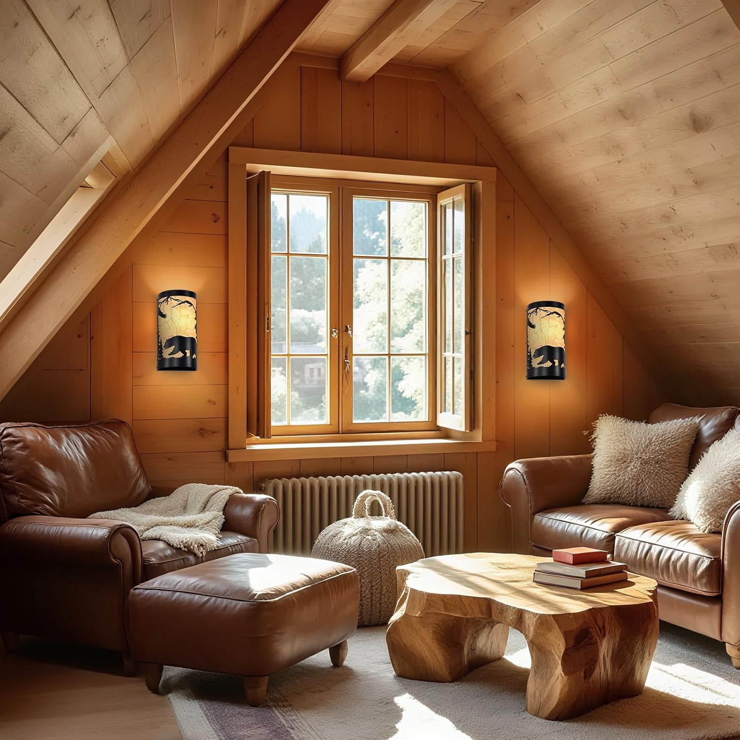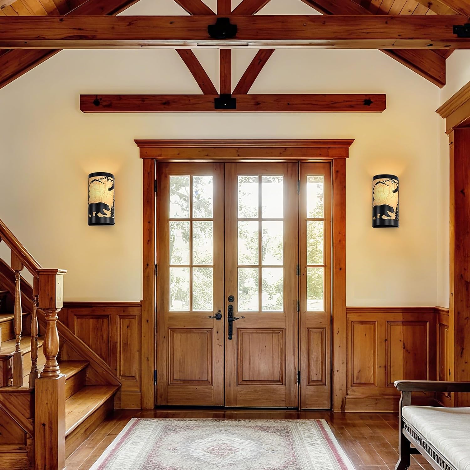 - Rustic Design:The wall sconce light set of 2 are crafted from durable matte black metal,featuring intricate forest elements and a bear silhouette,yellow parchment paper adds a soft,warm glow,enhancing industrial aesthetic of the vintage wall sconce
