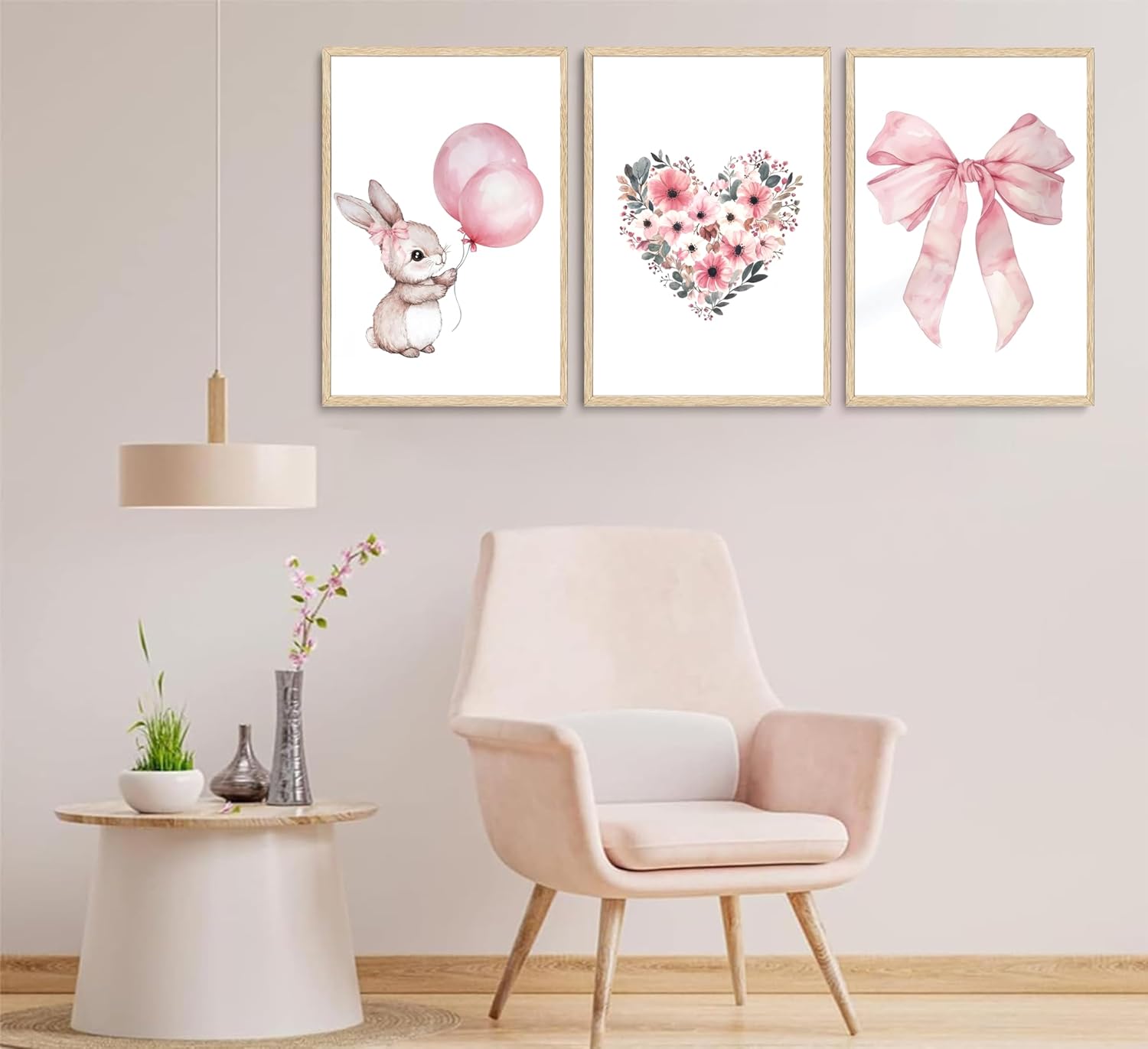 3Pcs Cute Bunny Canvas Wall Art Pink Bow Easter Poster Prints Love Wildflowers Picture Decoration for Nursery Girl Bedroom Children's Room Easter Gifts for Kids Unframed