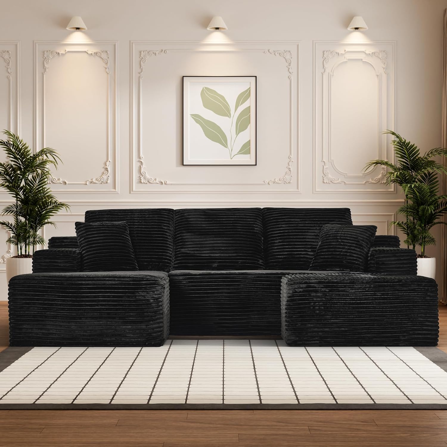 Modular Sectional Sofa Cloud Sectional Couch, 107" Comfy Fluffy U Shaped Black Couches for Living Room, Deep Seat Memory Foam Plush Corduroy Boneless Couch Sectionals with Left Facing Chaise Sofa