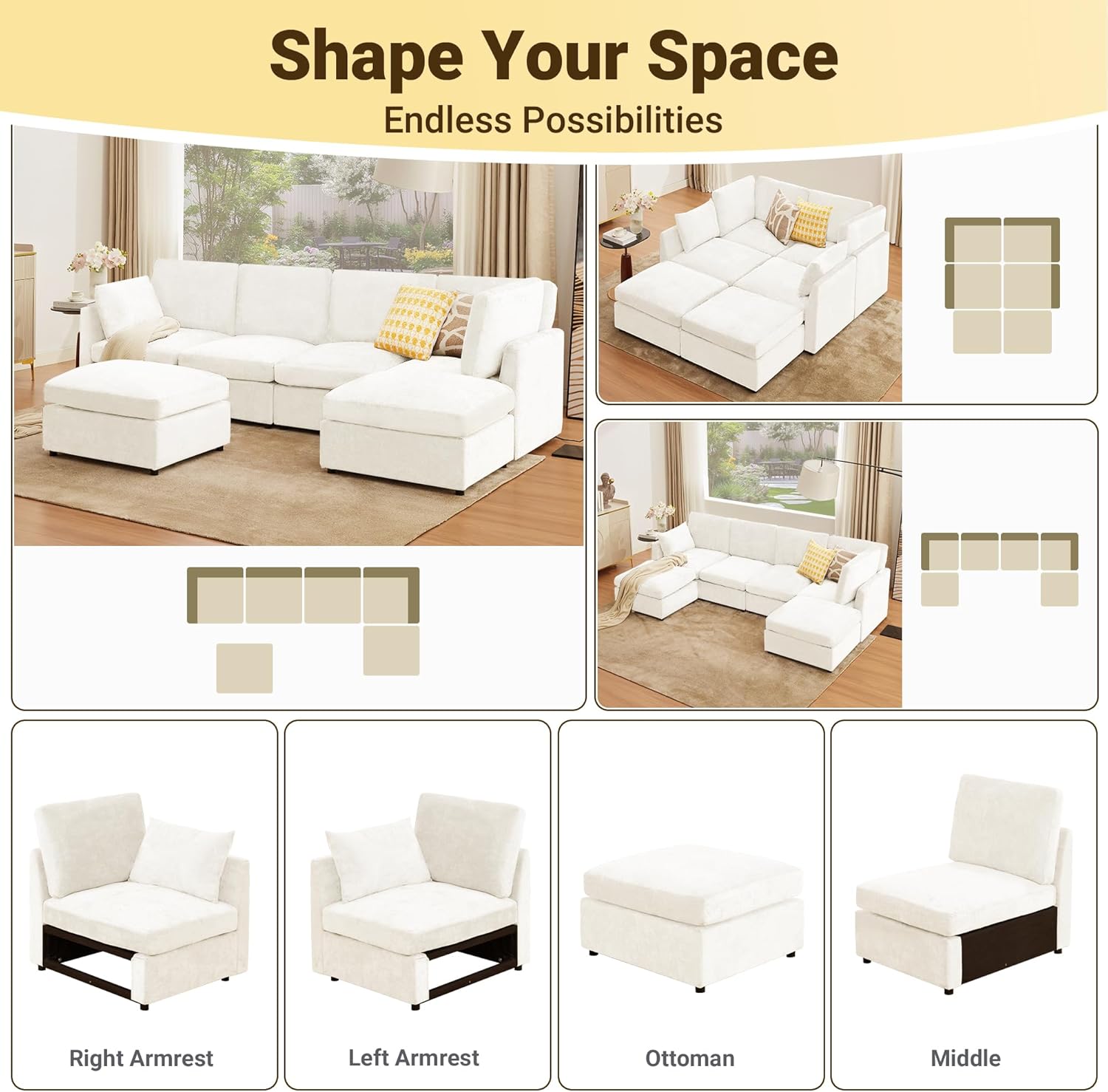 - Modular Design - Enjoy versatile comfort with our modular sofa that transforms to suit your needs. Easily configure it as an L-shaped sectional, U-shaped lounge, or guest bed. The flexible design adapts to your space and lifestyle, offering both style and function.