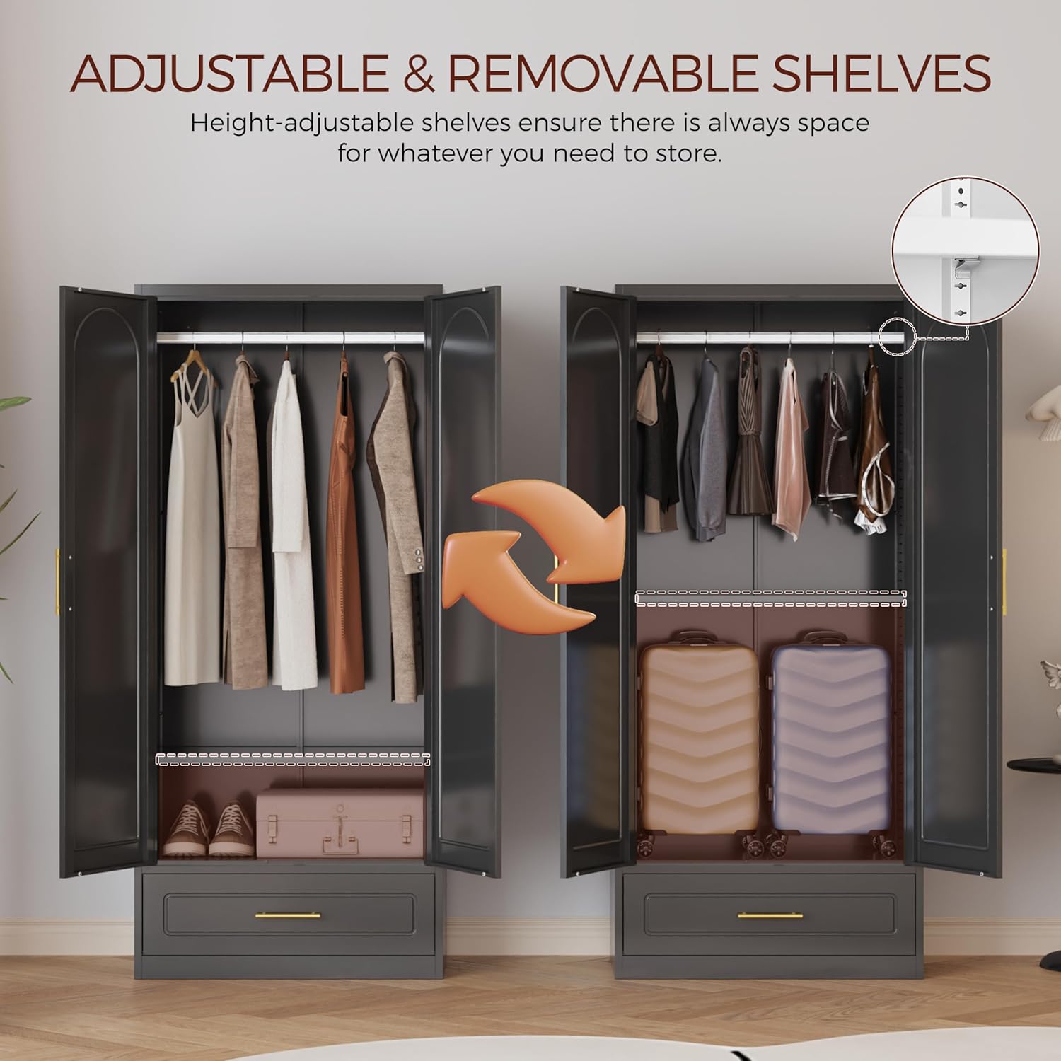 - Large Storage Space: Tall wardrobe closet size: 71"H * 31.5"W * 17.7"D. The steel wardrobe is equipped with hanging rods and 2 height adjustable shelves, perfect for storing dresses, suits, pants and more. Adjustable shelves for easy storage of shoes, pillows, storage boxes, documents and more.