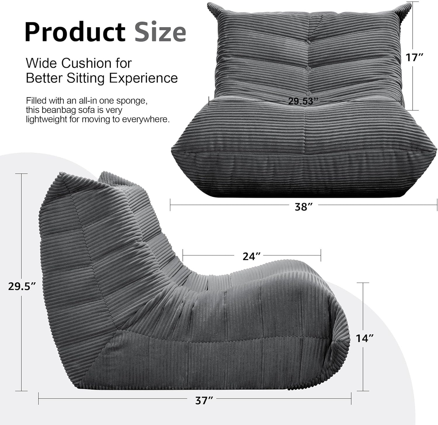 - Plump Filling: The interior of the lazy bean bag chair is cut from high-density sponge, it has high rebound, strong supportive characteristics, durable, not easy to deform, to provide users with a good sitting feeling. This sofa is different from the traditional frame sofa, lighter in weight and easy to move.