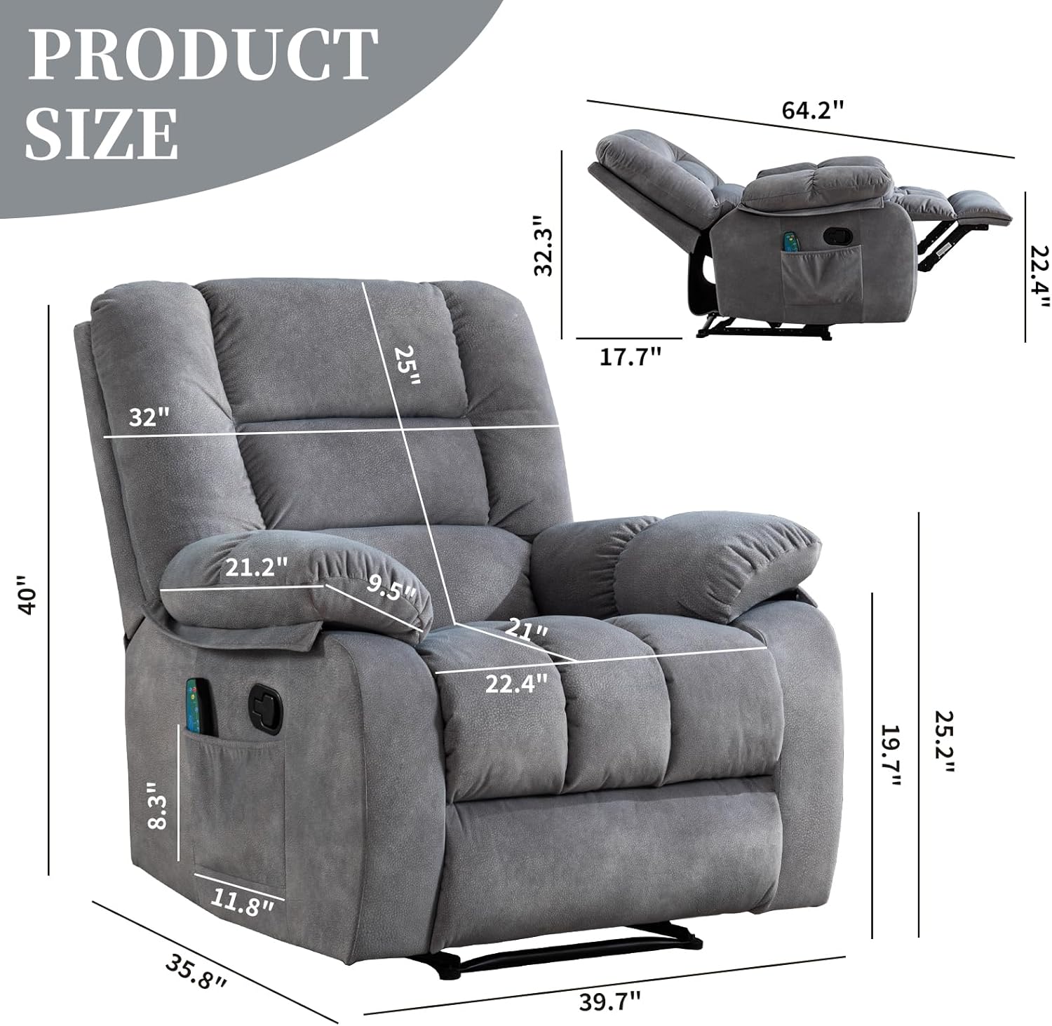 Massage Recliner Chair with Heat and Massage, Soft Fabric Ergonomic Manual Reclining Chairs, Heavy Duty Reclining Sofa Chair with Side Pockets for Living Room (Light Grey)