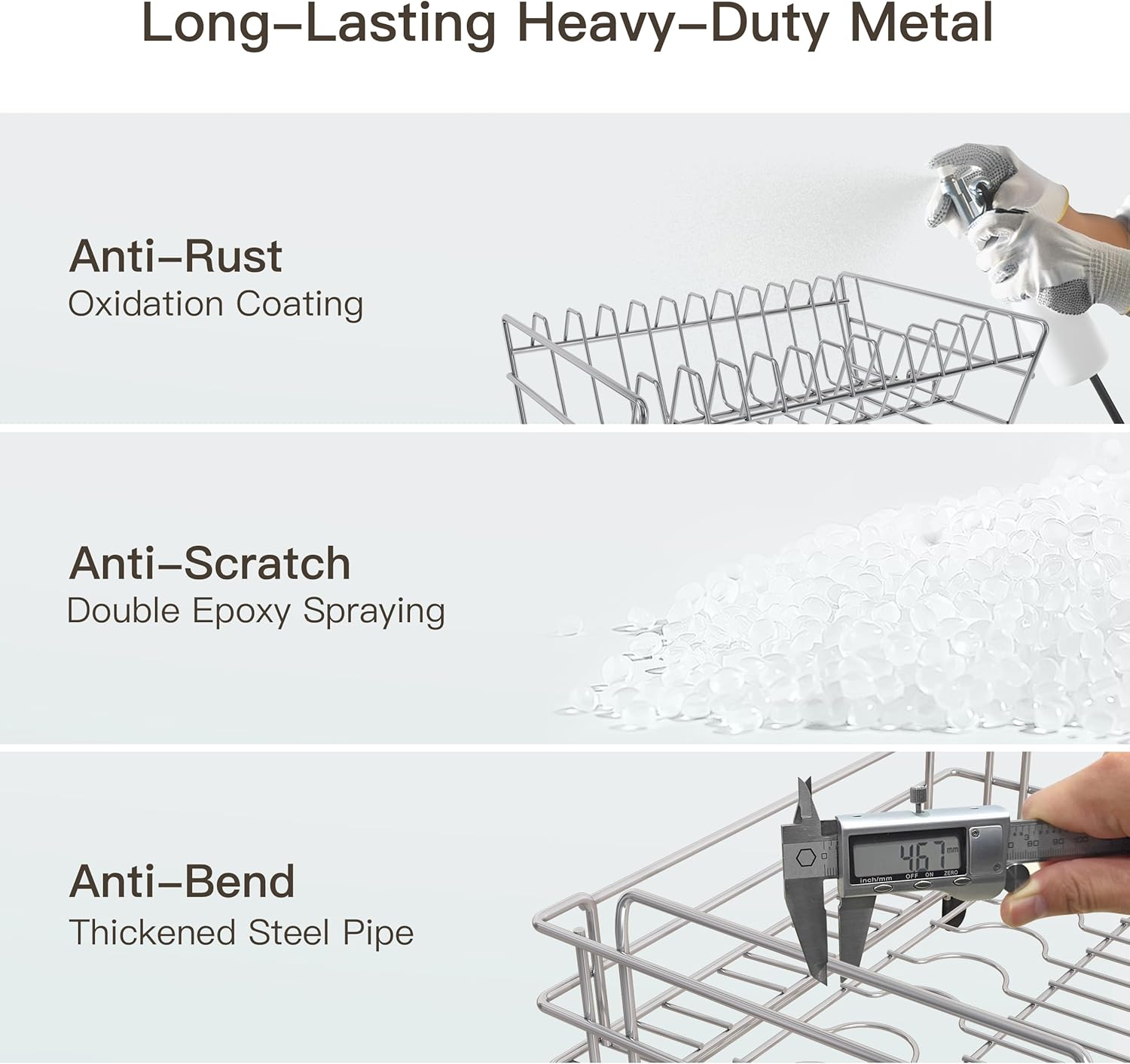 - 🔩 Rust-Resistant & Heavy-Duty Metal Dish Drying Rack: Durable metal dish drying rack with anti-oxidation coating. Withstands daily use—no bending, peeling, or wear over time