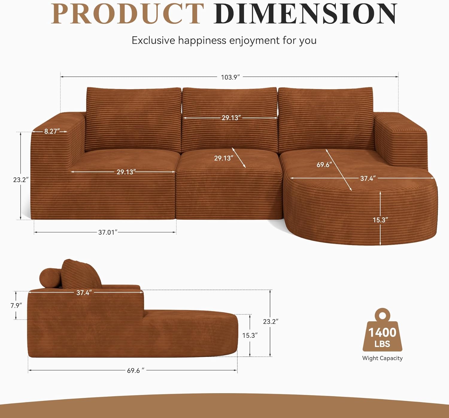 Modular Sectional Sofa with L-Shape Chaise,Cloud Sectional Modern Sleeper Couch with Deep Seat,Sponge Compression Sofas No Assembly Required(Brown-Corduroy Fabric) 1PCS