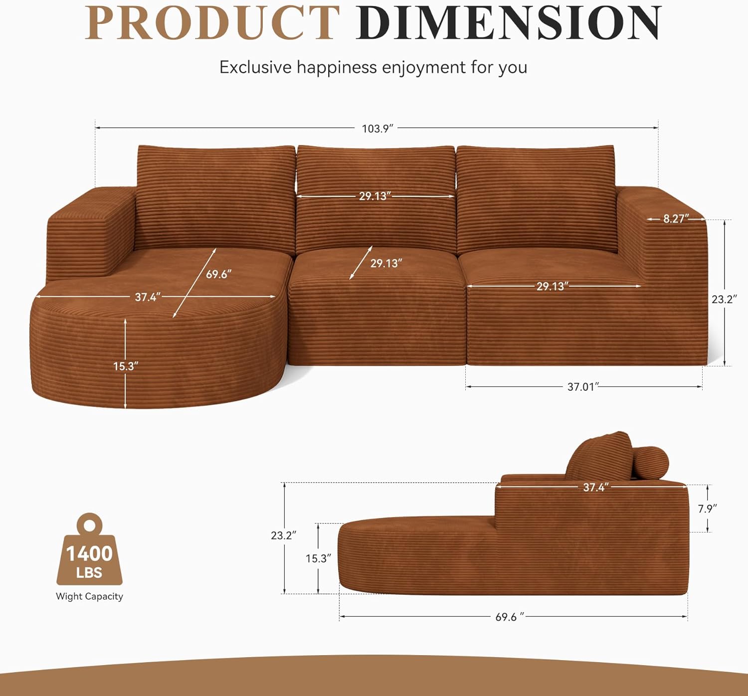 Modular Sectional Sofa with L-Shape Chaise,Cloud Sectional Modern Sleeper Couch with Deep Seat,Sponge Compression Sofas No Assembly Required (Brown-Corduroy Fabric) 1PCS