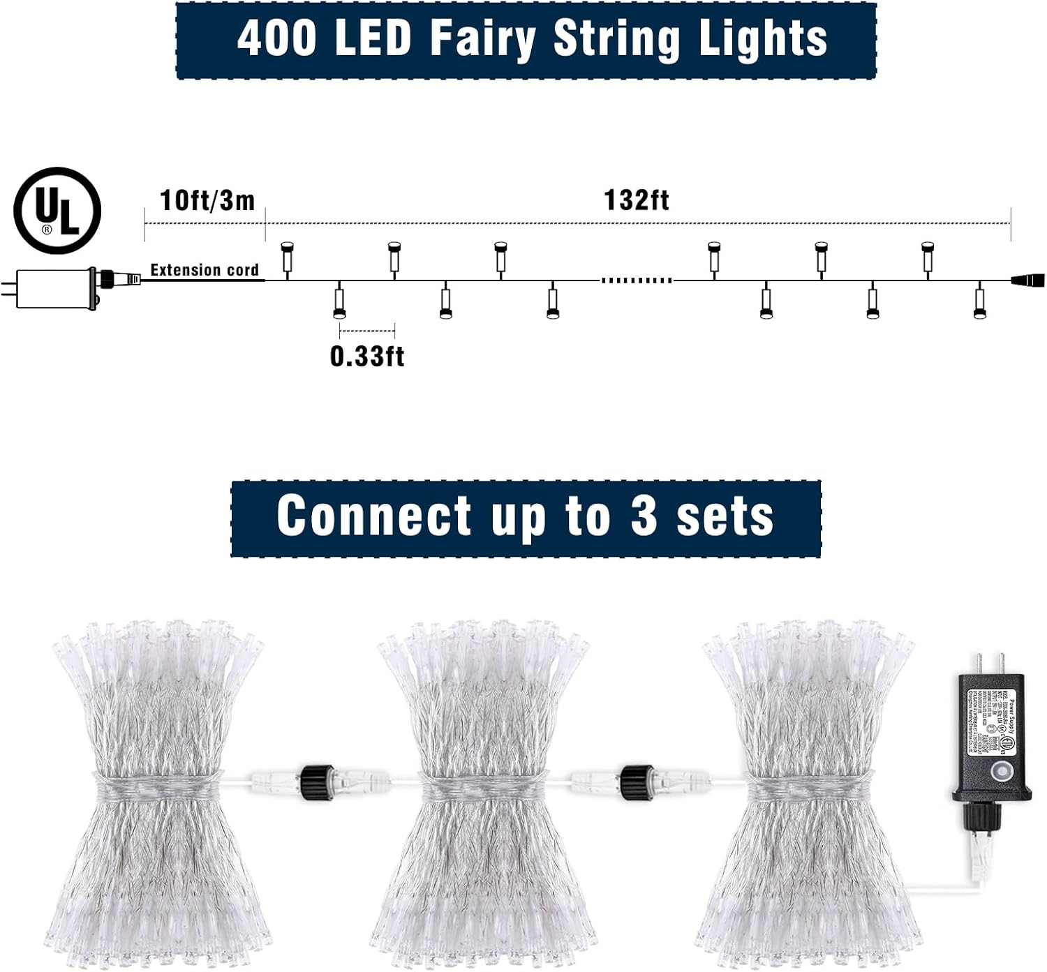 - Red and White Christmas Lights: 400 LED string lights total length is 141 ft, including 131 ft Christmas lights and a 10 ft extension cord. End-to-end connectable Christmas string lights can connect up to 3 strings for your decorative needs. The connecting string lights can be controlled by one controller.
