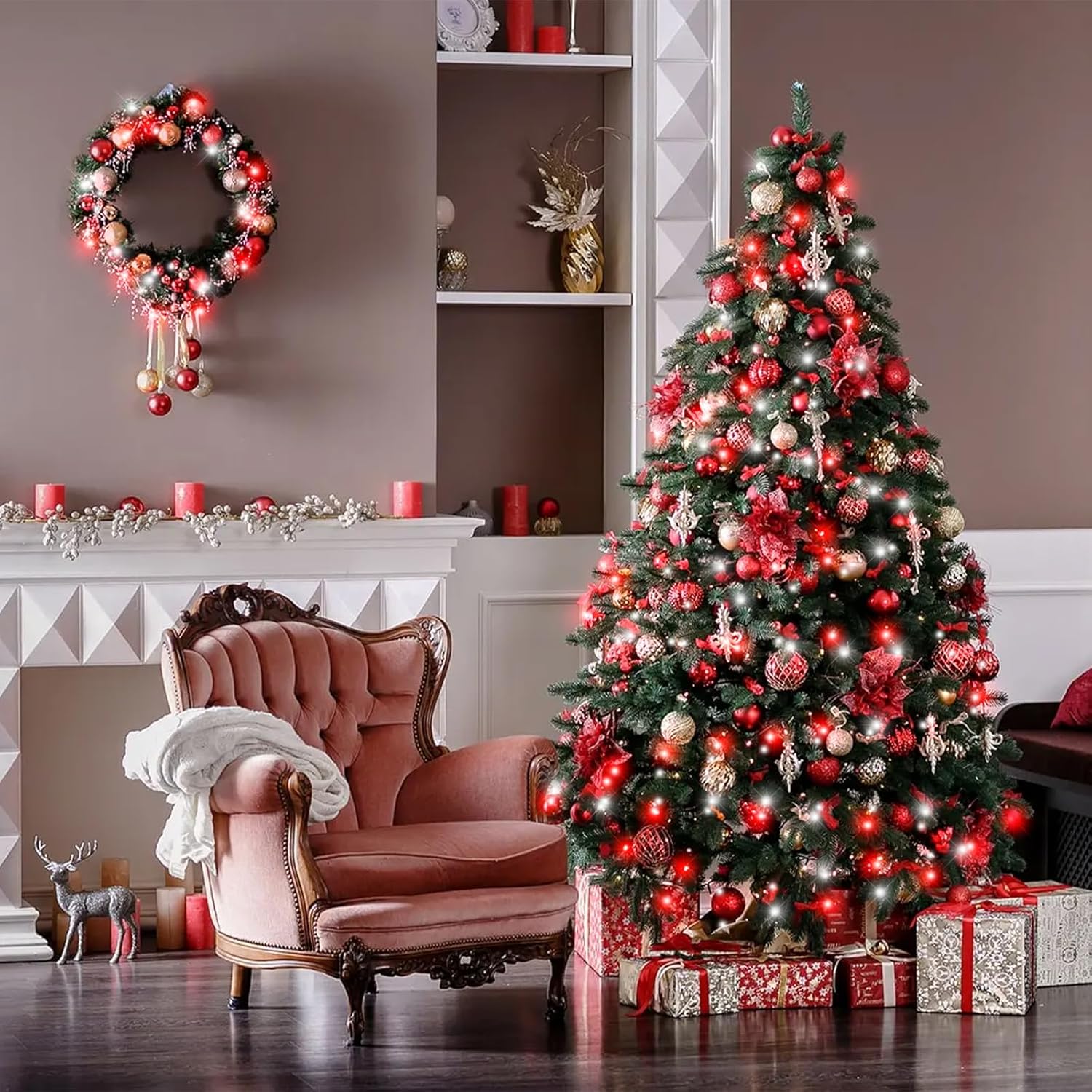 400 LED Red and White Christmas Lights Outdoor, 131ft Christmas String Lights 8 Modes Clear Wire, Plug in Waterproof Twinkle Fairy Lights for Bedroom Christmas Decorations