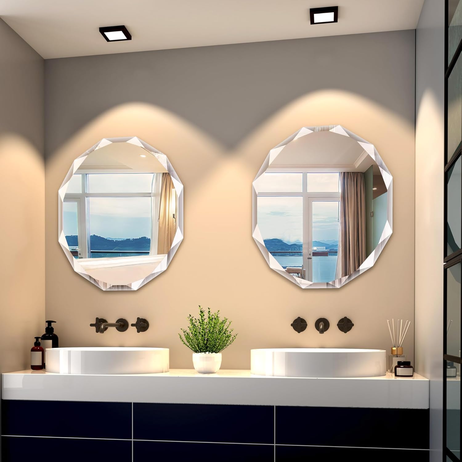 - DIAMOND BEVELED EDGE FRAMELESS DESIGN - Featuring a unique diamond beveled edge and frameless design to ensure clear imaging, bathroom Mirror offers a sleek, minimalist aesthetic that seamlessly integrates into modern interiors while enhancing spatial depth.