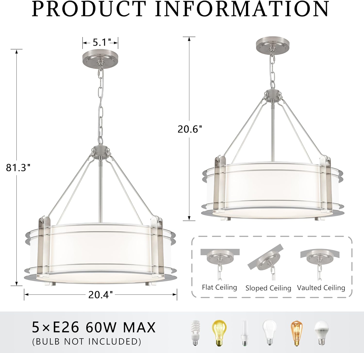 20.4''Drum Chandelier,5-Light Brushed Nickel Modern White Fabric Chandeliers,Farmhouse Round Pendant Light Fixture for Dining Room Kitchen Island Living Room Bedroom Hallway