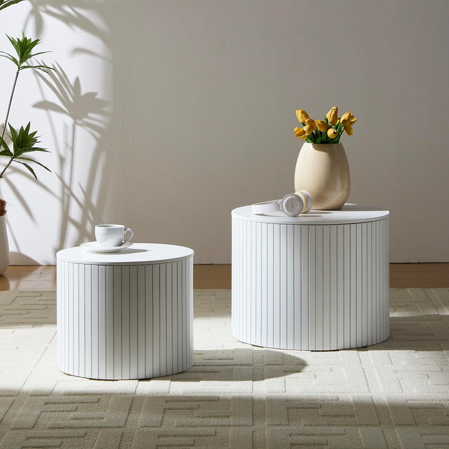 Round Coffee Table with Storage,19.17" Nesting Coffee Table Set of 2,Mid Century Modern End Table for Living Room,Side Table for Apartment,Office,Dorm(White)