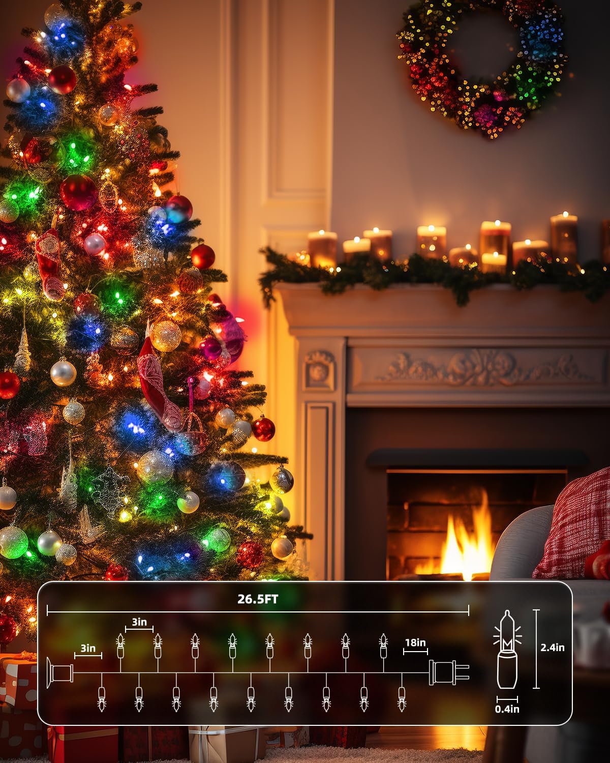 - 【Festive Mini Christmas Lights Set】This set includes 100 mluticolored incandescent mini-lights on 26.5 ft white wire, with bulbs spaced 3-inche apart and 18-inch lead wire. Perfect for holiday decorating, with the ability to connect up to 5 light strings end-to-end;