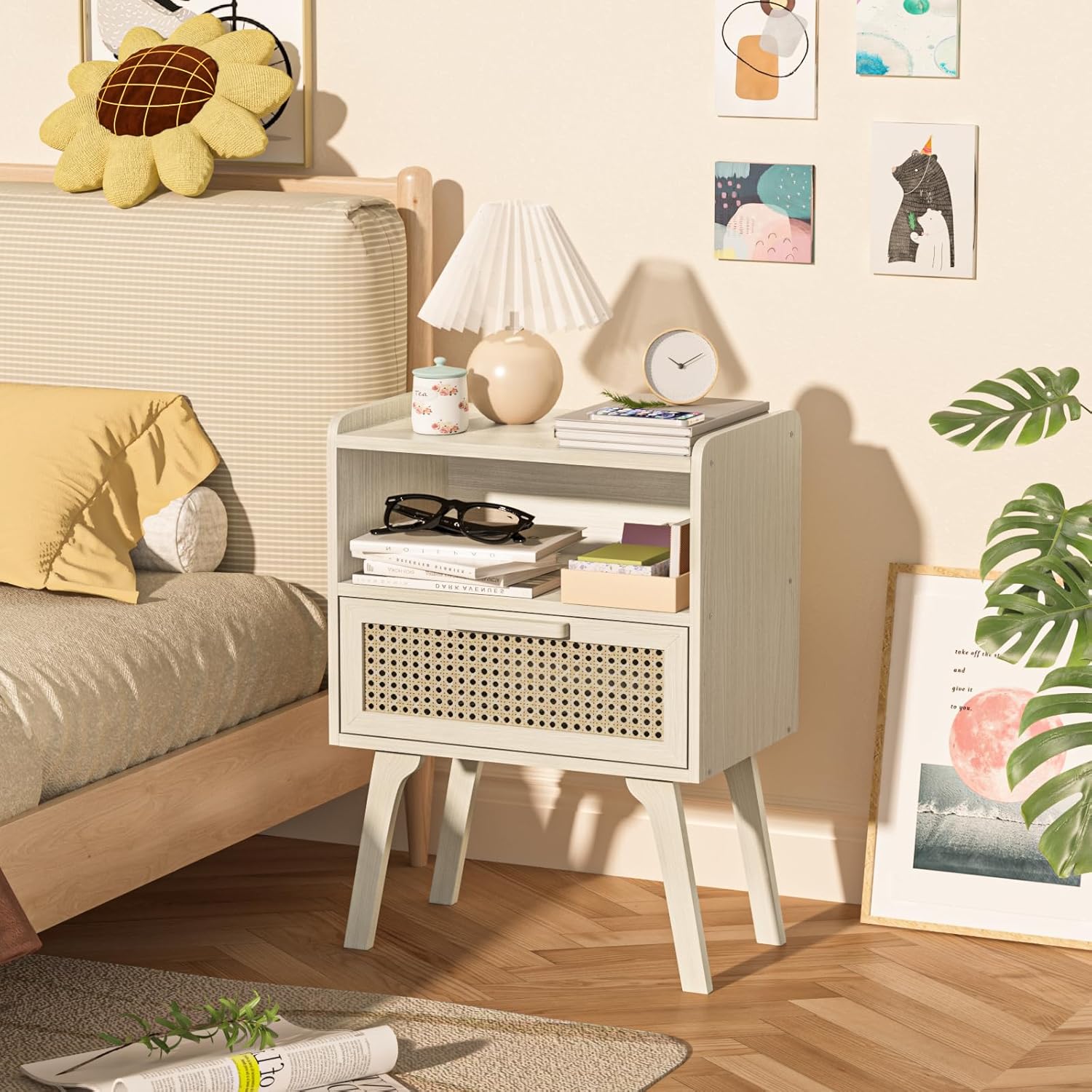 - [Large Storage Space and Reliable Material] Spacious table top, woven mesh drawer and open shelf can meet your storage needs. The natural wood nightstand is made of sturdy wood boards and high quality beech legs. Its chic legs also bring a touch of visual appeal. It is reinforced by special screws to ensure its durability and stability, which can accompany you for many years.