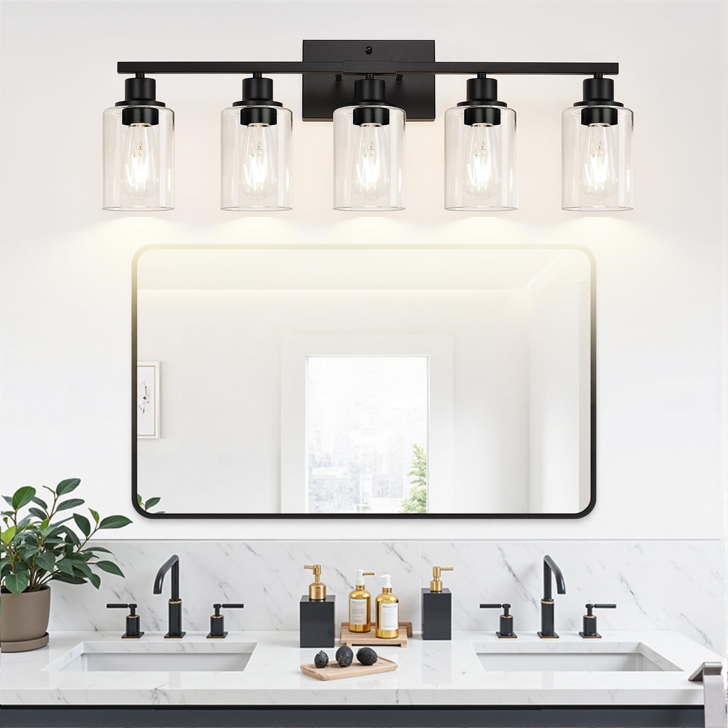 - [Sleek Modern Aesthetics] Perfect for modern or farmhouse decor, our 5 light bathroom vanity light pairs a matte black metal body with thick clear glass shades. This exquisite bathroom vanity light is suitable for various decoration styles, making it the perfect choice to enhance your home lighting. Product size: 28in L x 7in W x 11.56in H