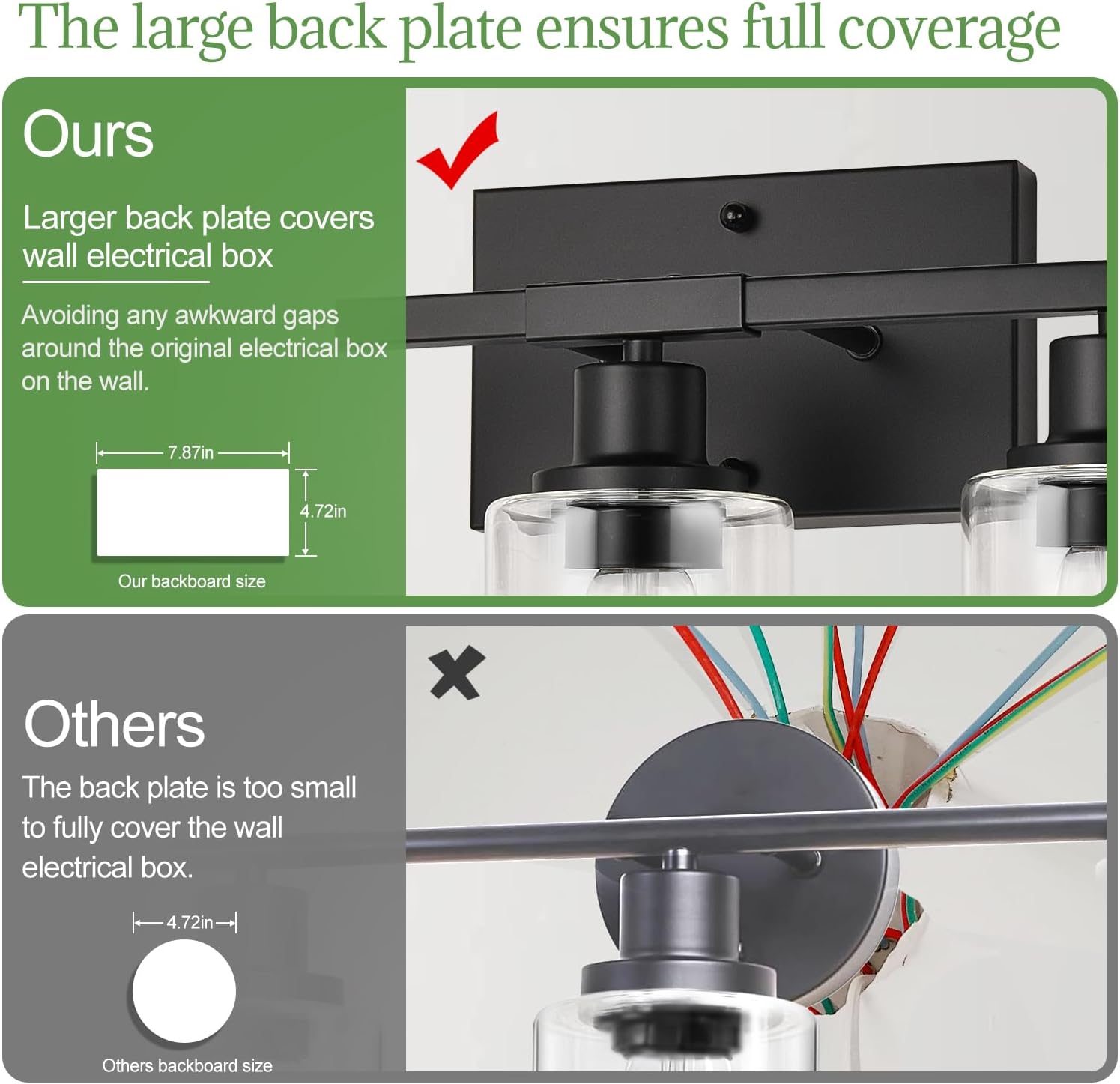 - [High-Quality Materials That Last] Made from premium metal, this black bathroom light fixture is built to last — the sturdy lamp arms won’t bend or warp easily. The upgraded finish adds a sleek, elegant look while resisting scratches, stains, and fingerprints, helping your light stay looking new for years to come.