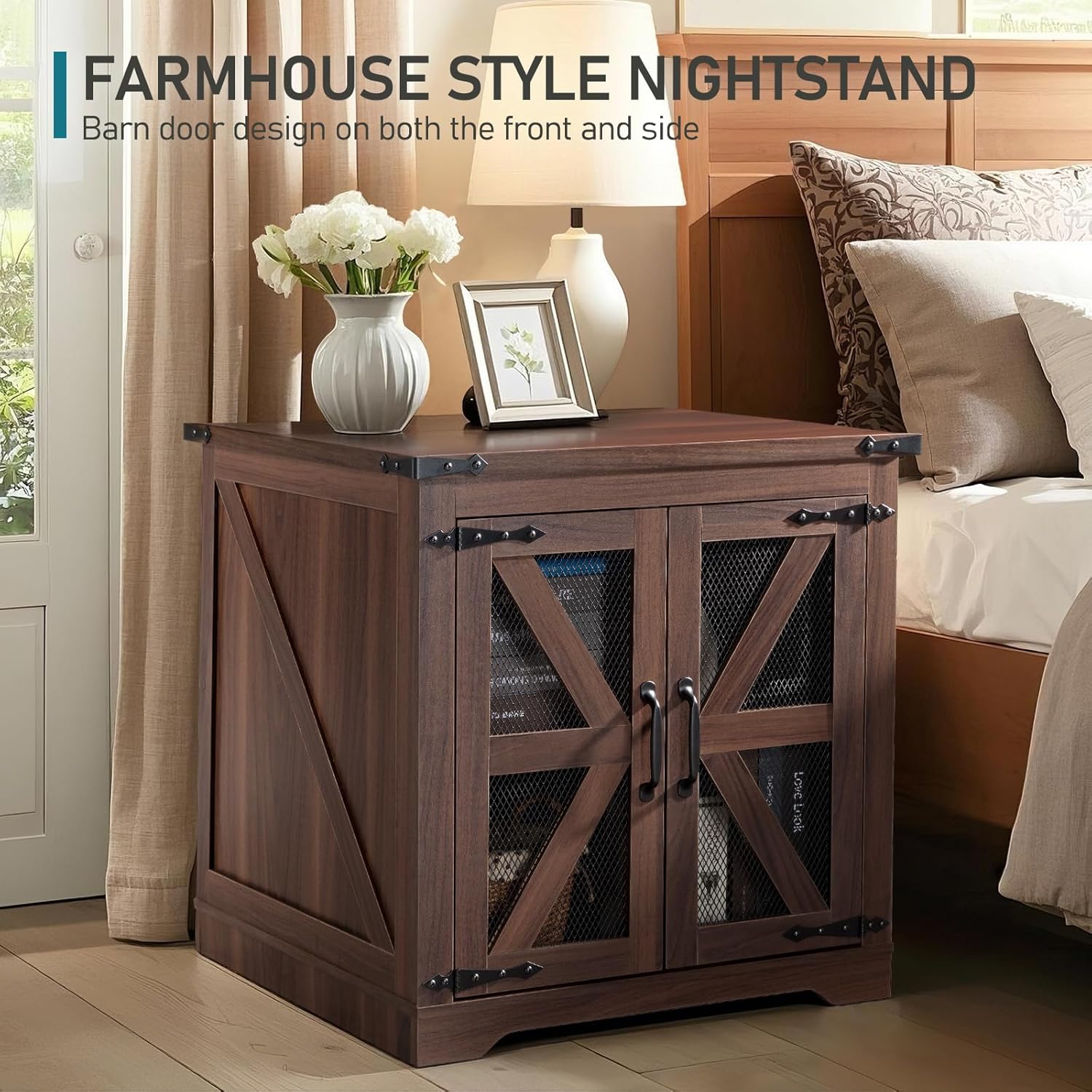 Farmhouse End Table, 24" Large Sofa Side Table with Charging Station, Mesh Barn Door, Rustic Wood Nightstand with Adjustable Storage Shelf, Square Nightstand for Living Room