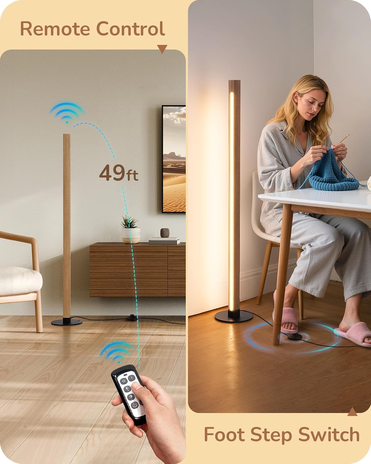 - [Remote & Foot Switch] Use the included remote control (up to 49ft range) for convenient access to this led corner floor lamp, or operate via the foot switch—tap to ON-2700K/4500K/6000K-OFF, or long press for stepless dimming