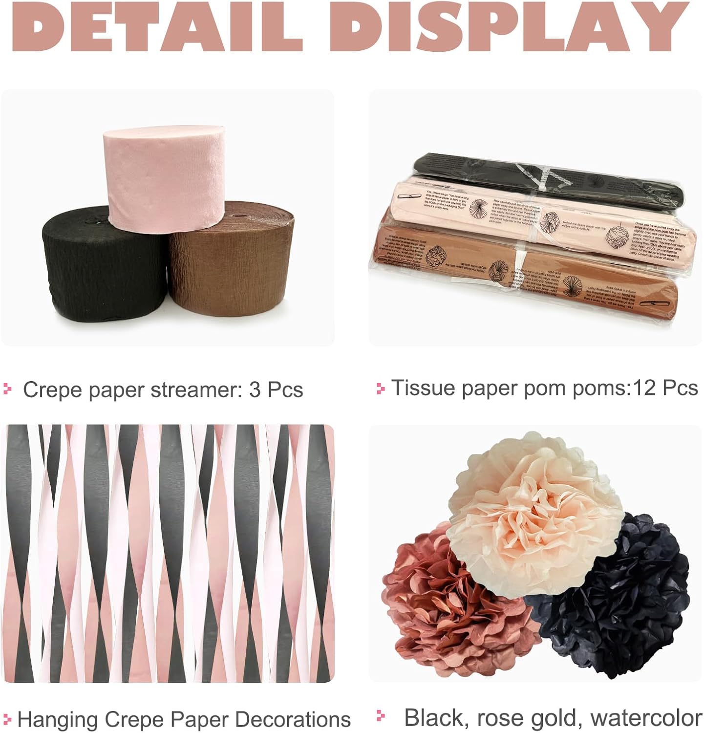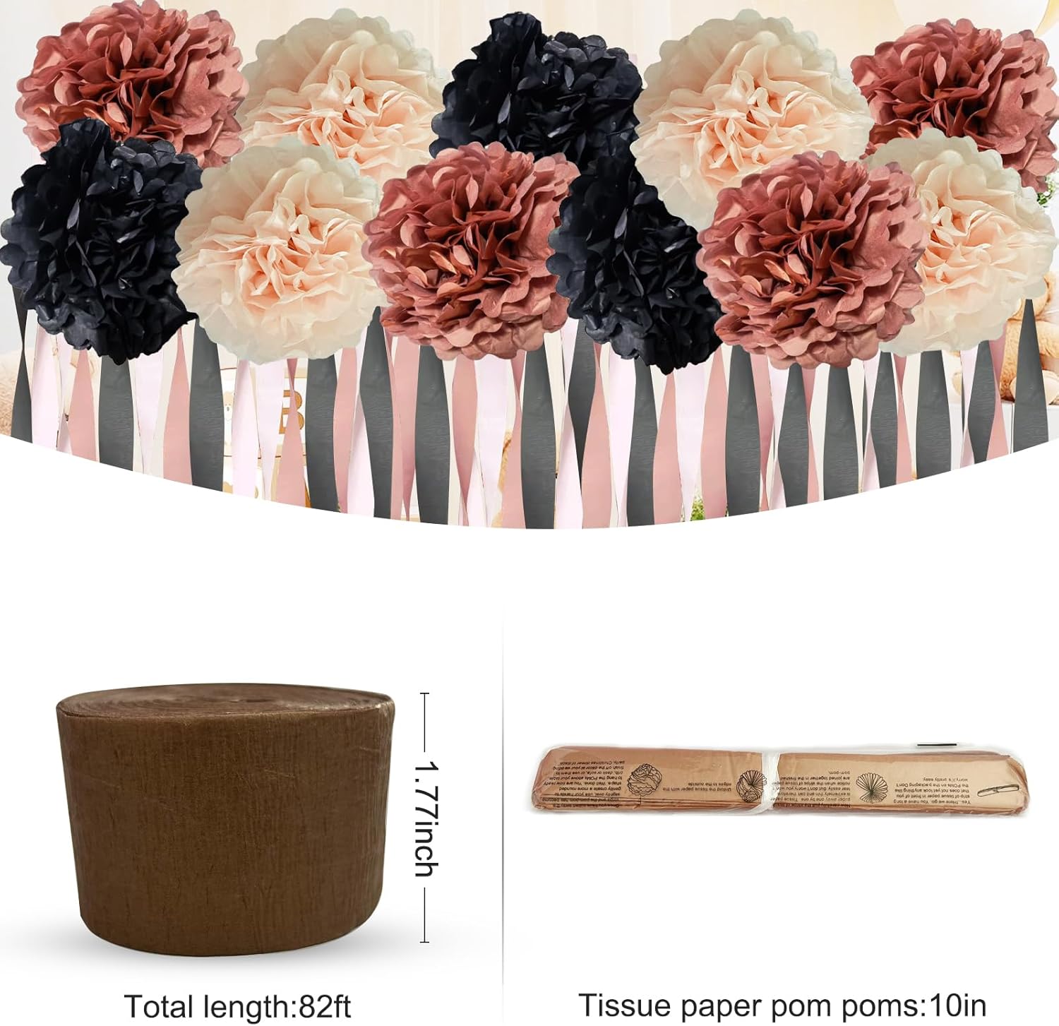 - PERFECT SIZE - 12 dreamy paper pompoms are 10 inches in size, and the tassel streamers are 25m in one roll, with 3 rolls in total, 75m in total.