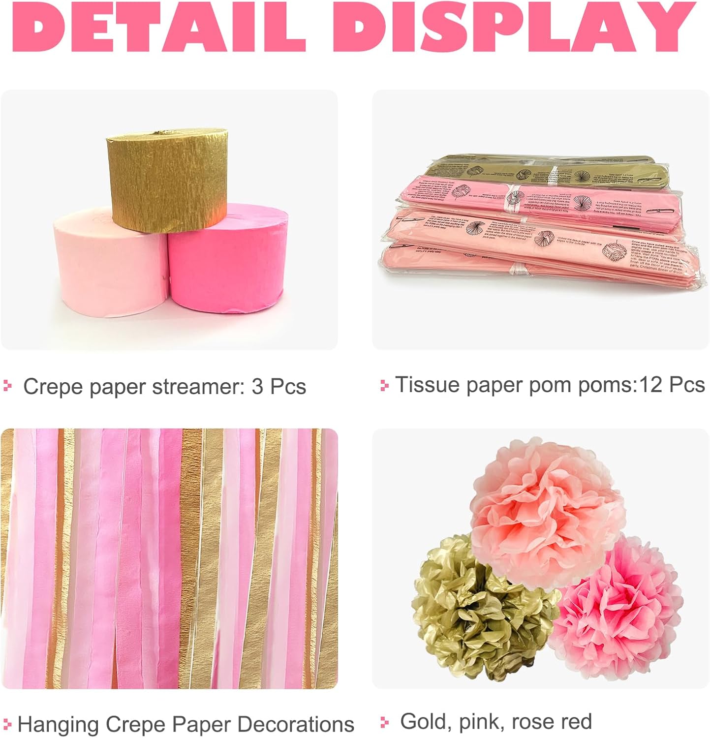 - PERFECT SIZE - 12 dreamy paper pompoms are 10 inches in size, and the tassel streamers are 25m in one roll, with 3 rolls in total, 75m in total.