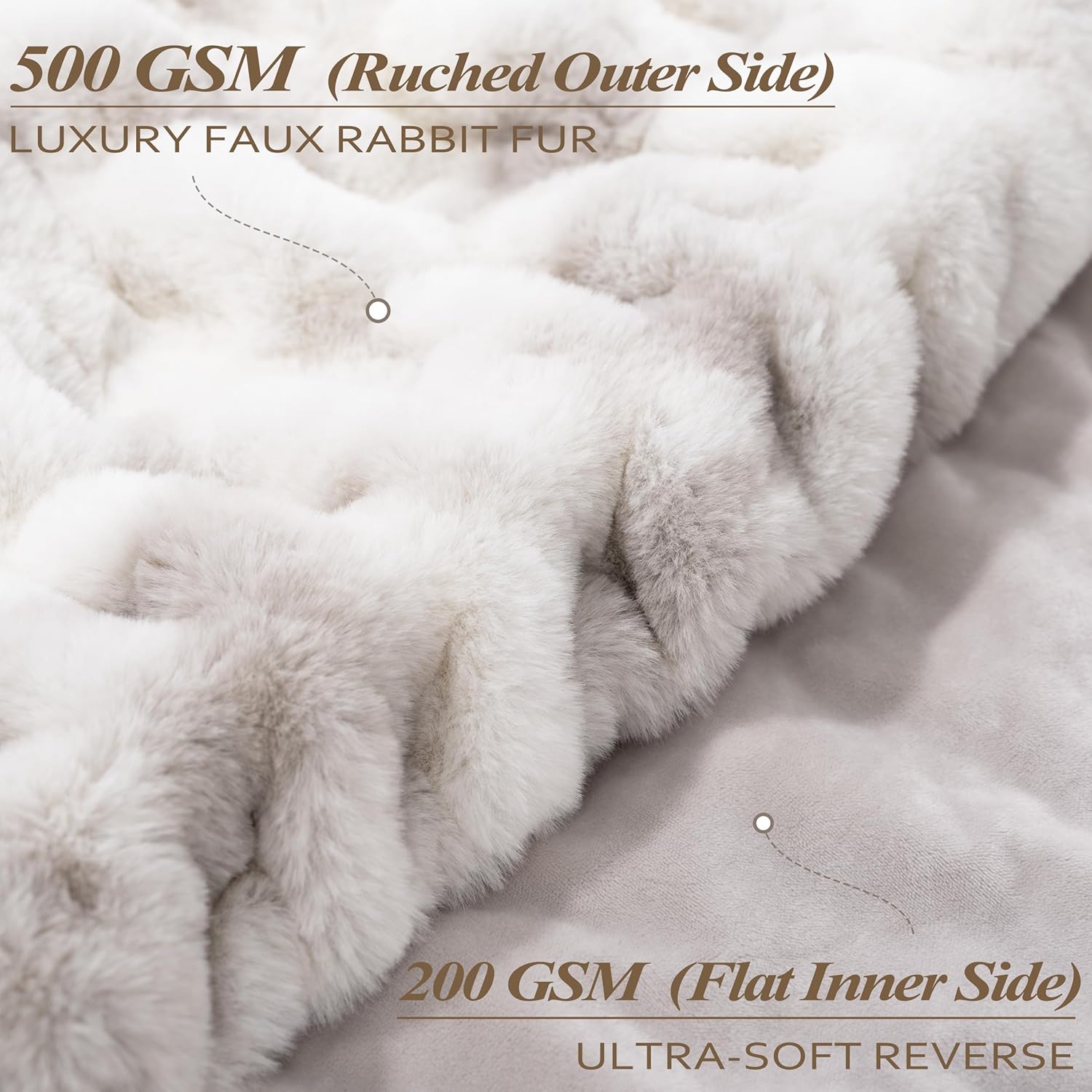 - Luxurious Comfort and Design: Experience exceptional comfort with our faux fur blanket, featuring 500 GSM ruched faux rabbit fur on the outer side and 200 GSM ultra-soft flat inner side. The unique ruched design adds a touch of elegance and visual interest, making it a beautiful addition to room. Its plush texture provides a velvety feel that's irresistibly soft to the touch