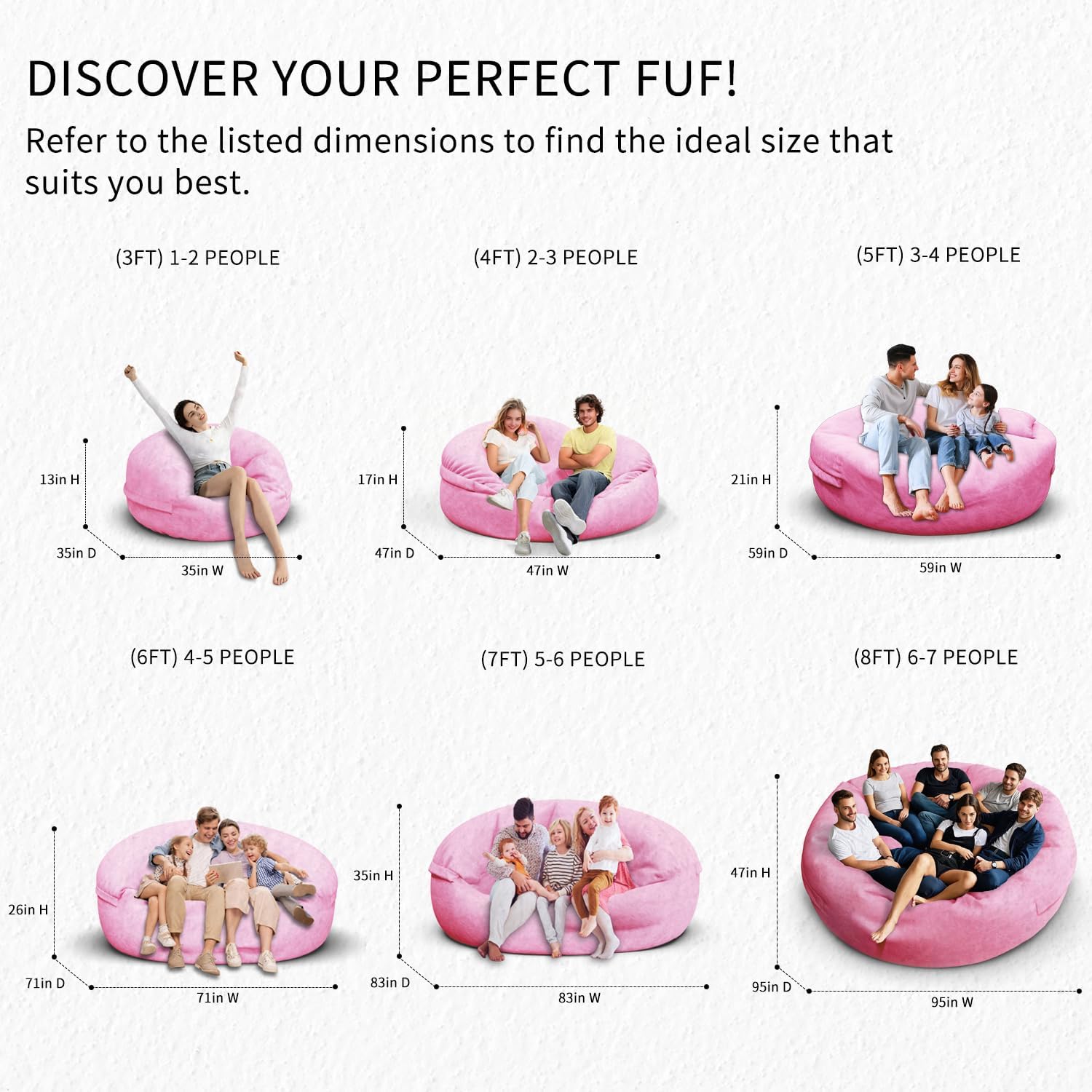- 【Choose The Perfect Size for Your Space】 Our Bean Bag Sofa Covers Are Available In Six Sizes, From 3ft To 8ft, Catering To Both Kids And Adults.The 3ft (Capacity: 1-2 People),4ft (Capacity: 2-3 People),5ft (Capacity: 3-4 People),6ft (Capacity: 4-5 People),7ft (Capacity:5-6 People),And 8ft (Capacity:6-30 People) Options Ensure You Find The Ideal Fit.Each Size Adds A Stylish Touch To Any Space,Making Them A Versatile Addition To Your Home.