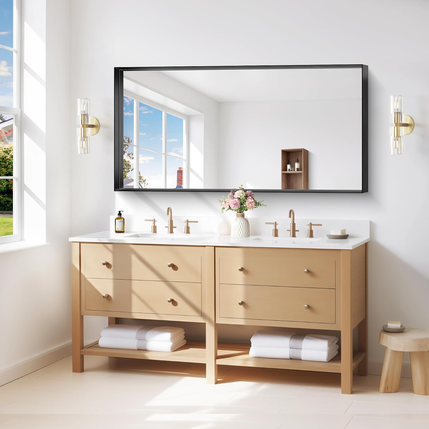 - Crystal-Clear Reflection, Zero Distortion: This black wall-mounted bathroom mirror delivers a true 1:1 image reflection—no blurring, warping, or distortion. The ultra-durable glass is scratch-resistant and easy to clean, making it the perfect vanity mirror for a sleek, modern bathroom.