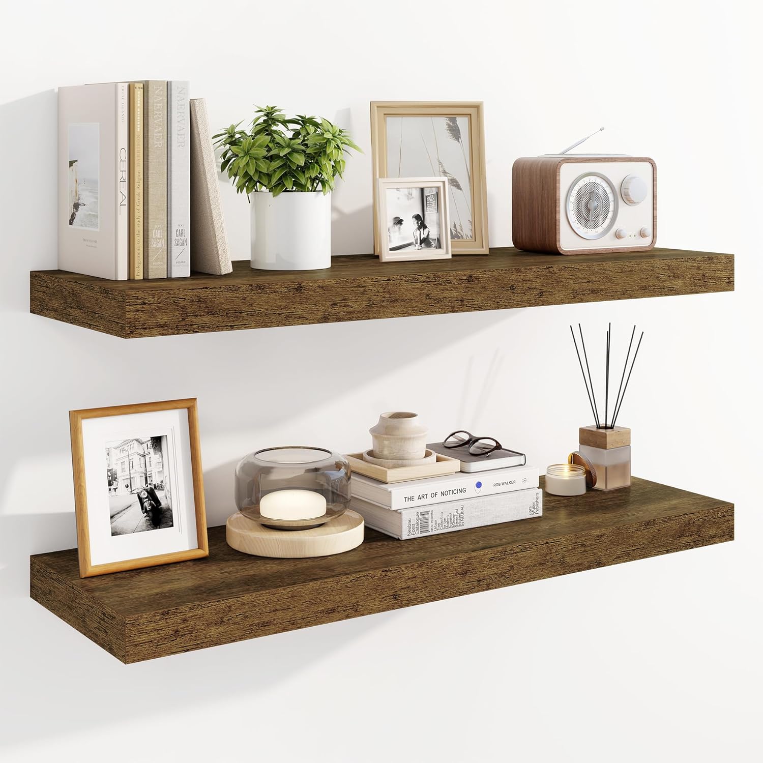 Marsmiles 31.5" Floating Shelves for Wall, Wooden Shelves with Invisible Brackets Set of 2, Rustic Farmhouse Wall Mounted Shelf for Kitchen Bathroom Living Room Study, Rustic Brown
