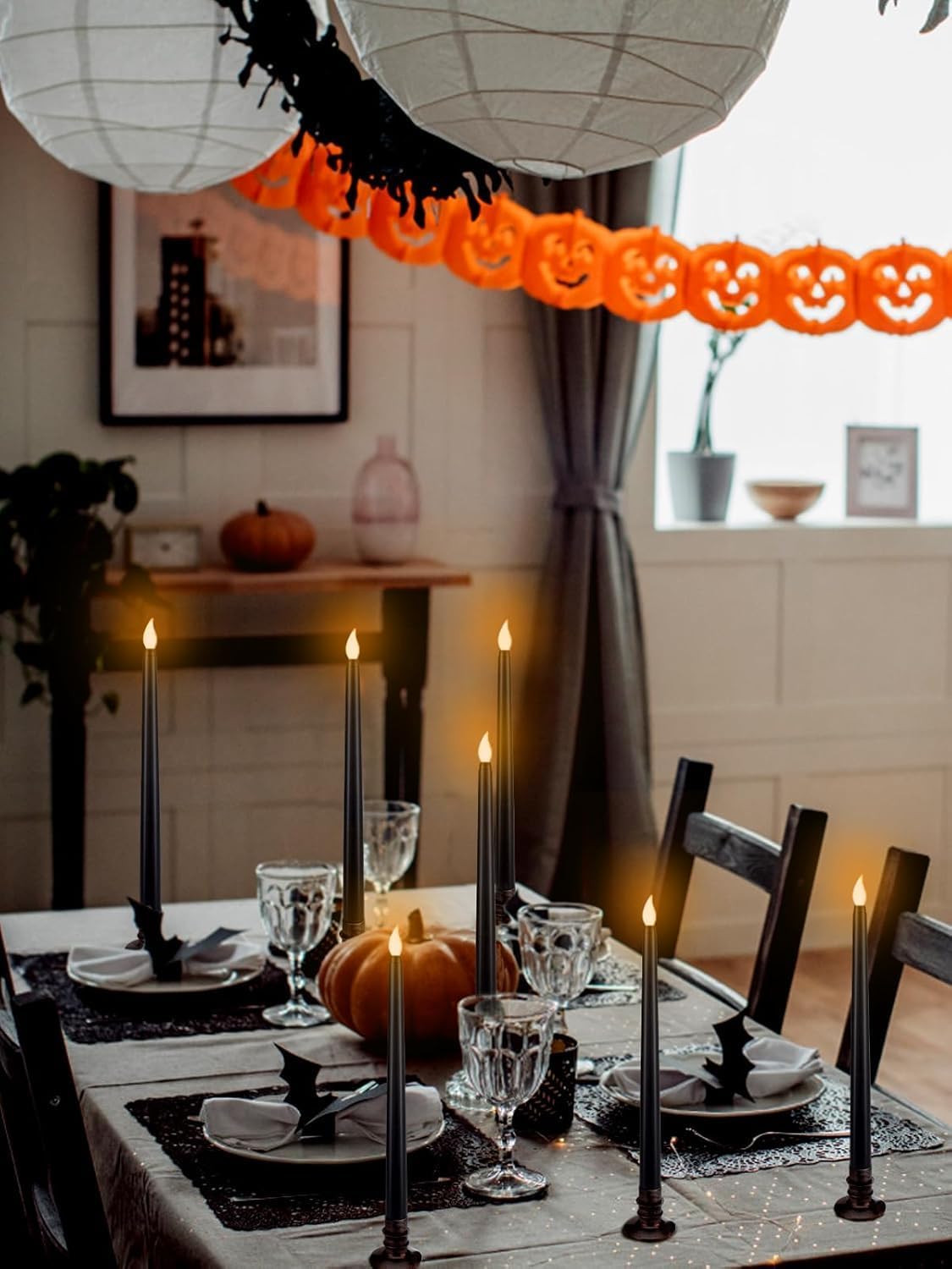 Alphatool 12 Pcs Halloween Black LED Flameless Candles with Bases - Flicker Flame, Tall Taper Smokeless Dripless Candles, Decor for Fireplace Diningtable Bar School