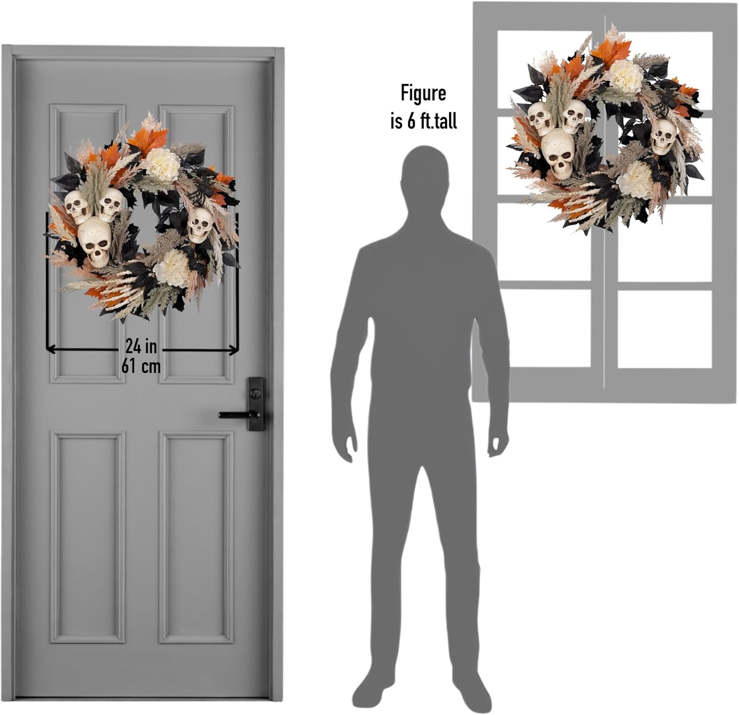 - SEASONAL DESIGN: Stunning Halloween wreath featuring realistic skulls, pampas grass, and a mix of black and orange autumn leaves for a perfect spooky yet sophisticated door decoration