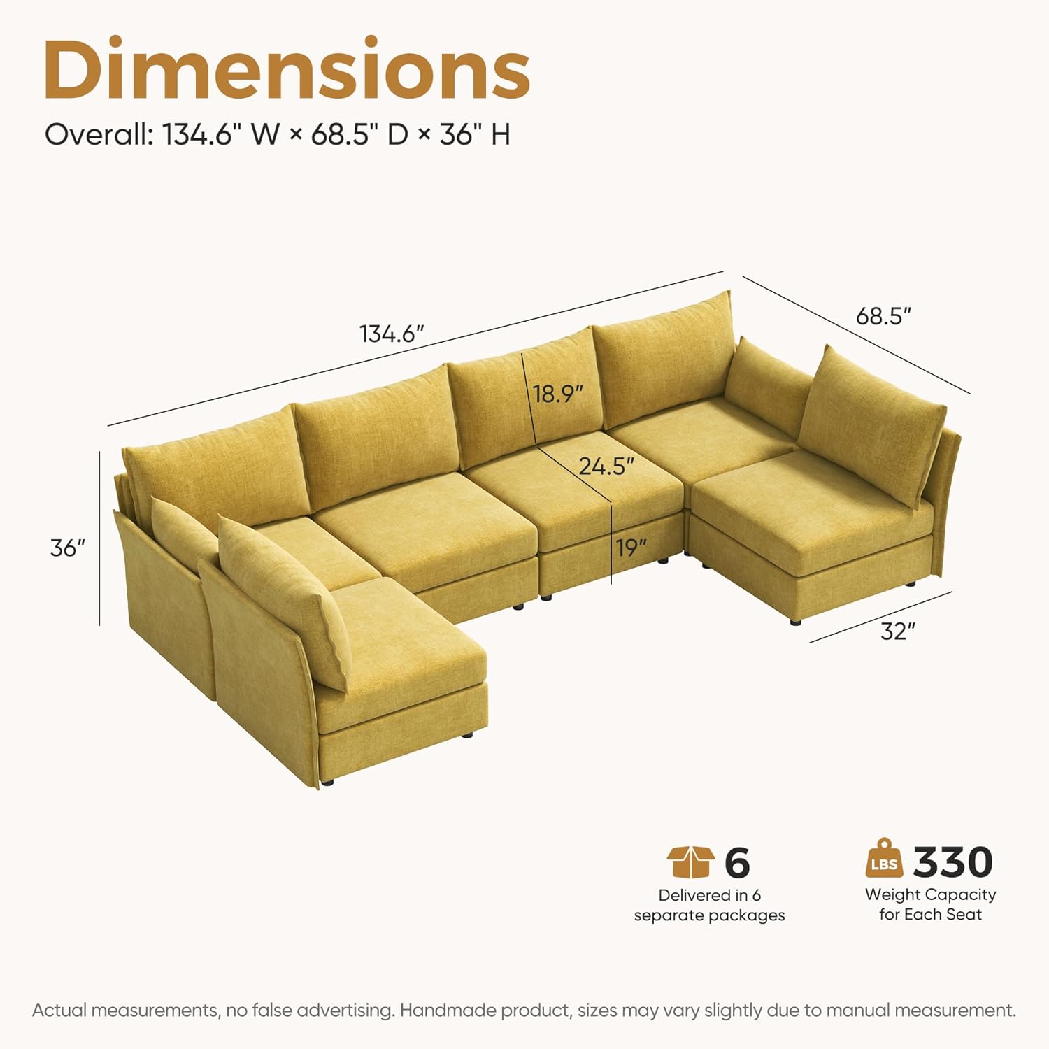 - đź’ˇ Stylish and Spacious Sectional Sofa - A blend of modern elegance and comfort, this yellow sofa is ideal for contemporary interiors. Customize seating and shape by adding or removing modules to fit your needs. It's perfect for your living room, family room, bedroom, or office. Overall size: 134.6" W Ă— 68.5" D Ă— 36" H, seat width: 32", seat depth: 24.5".